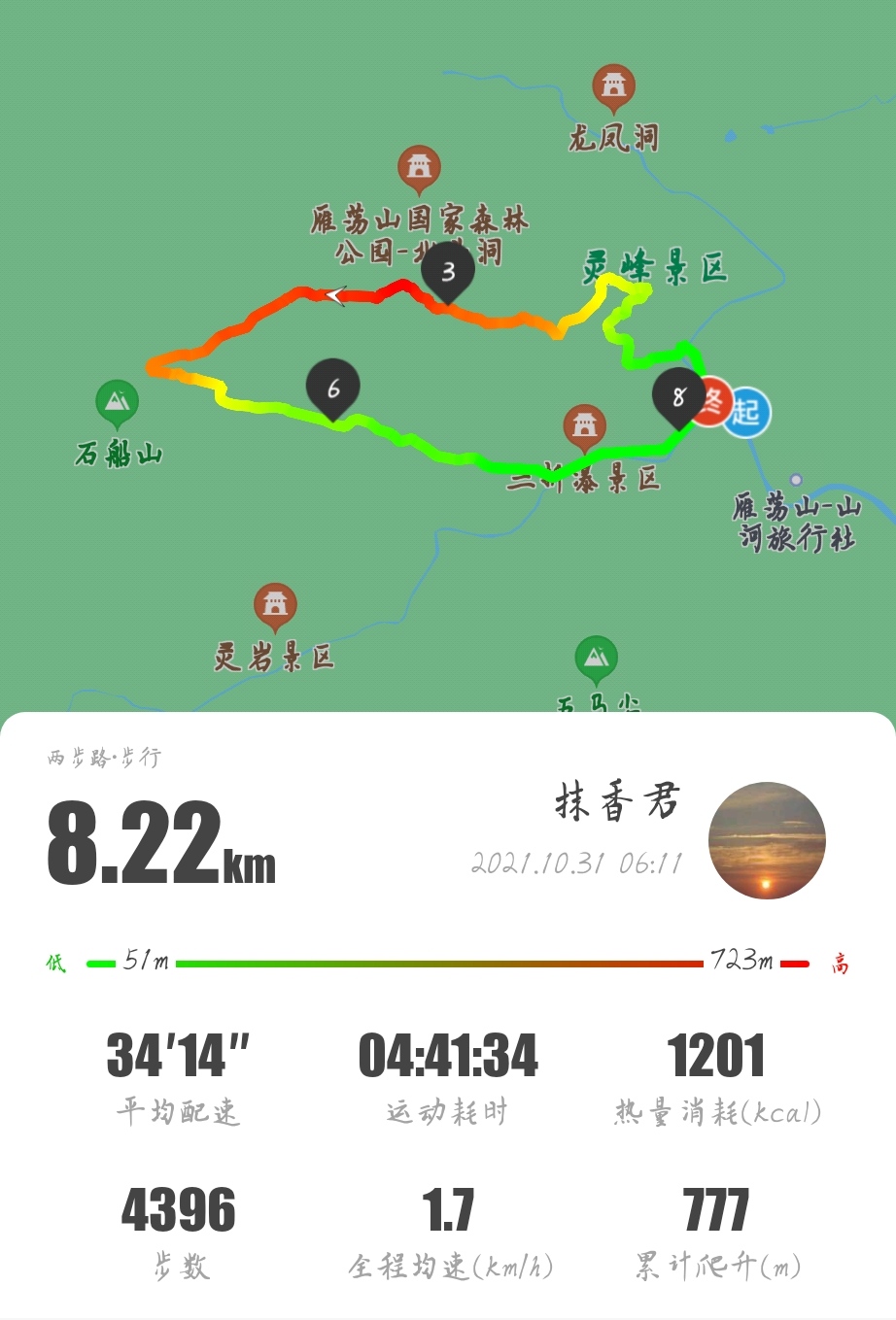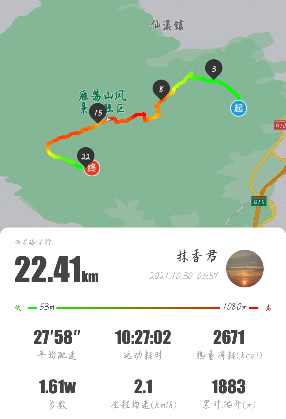 16:40时,行走22.5km、爬升1900m的我们,终于抵达雁湖景区出口,雁荡四尖征程顺利结束。随后,我们5位小伙伴打车回了客栈,而就在归程路上,偶然望下窗外,哇,鸭蛋黄,哦不,夕阳。美,就是出其不意;美,就是恰逢其时。
