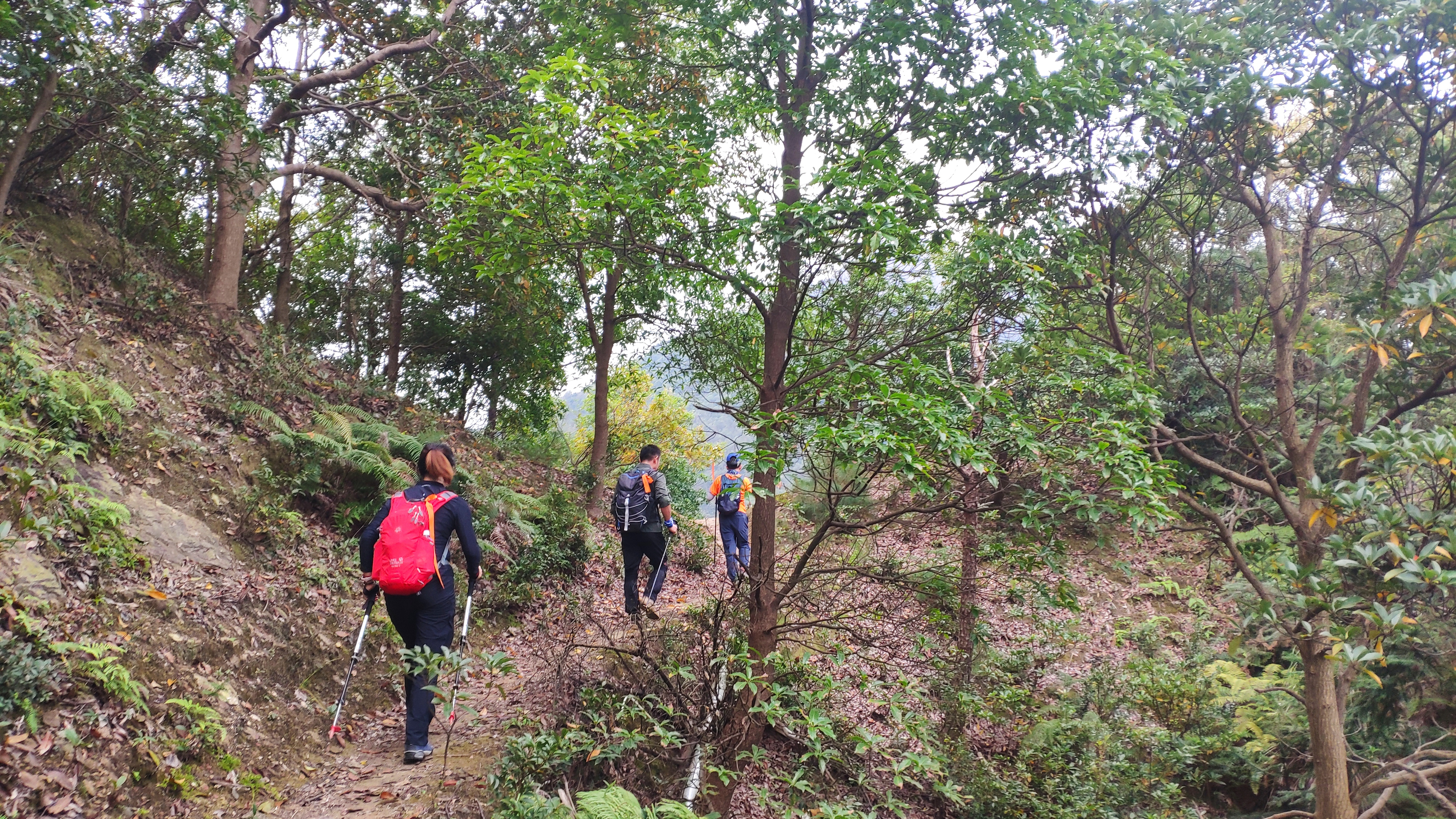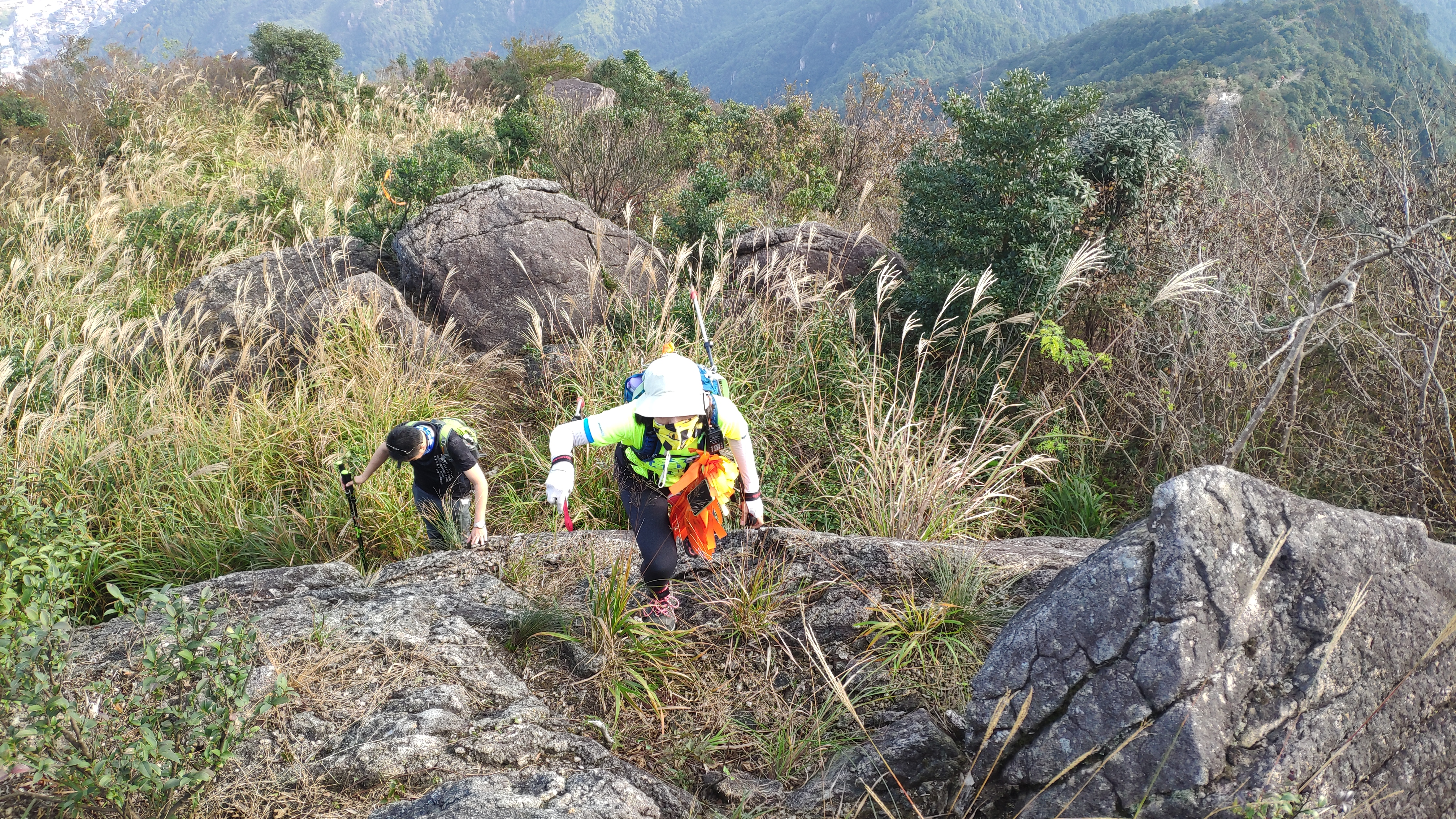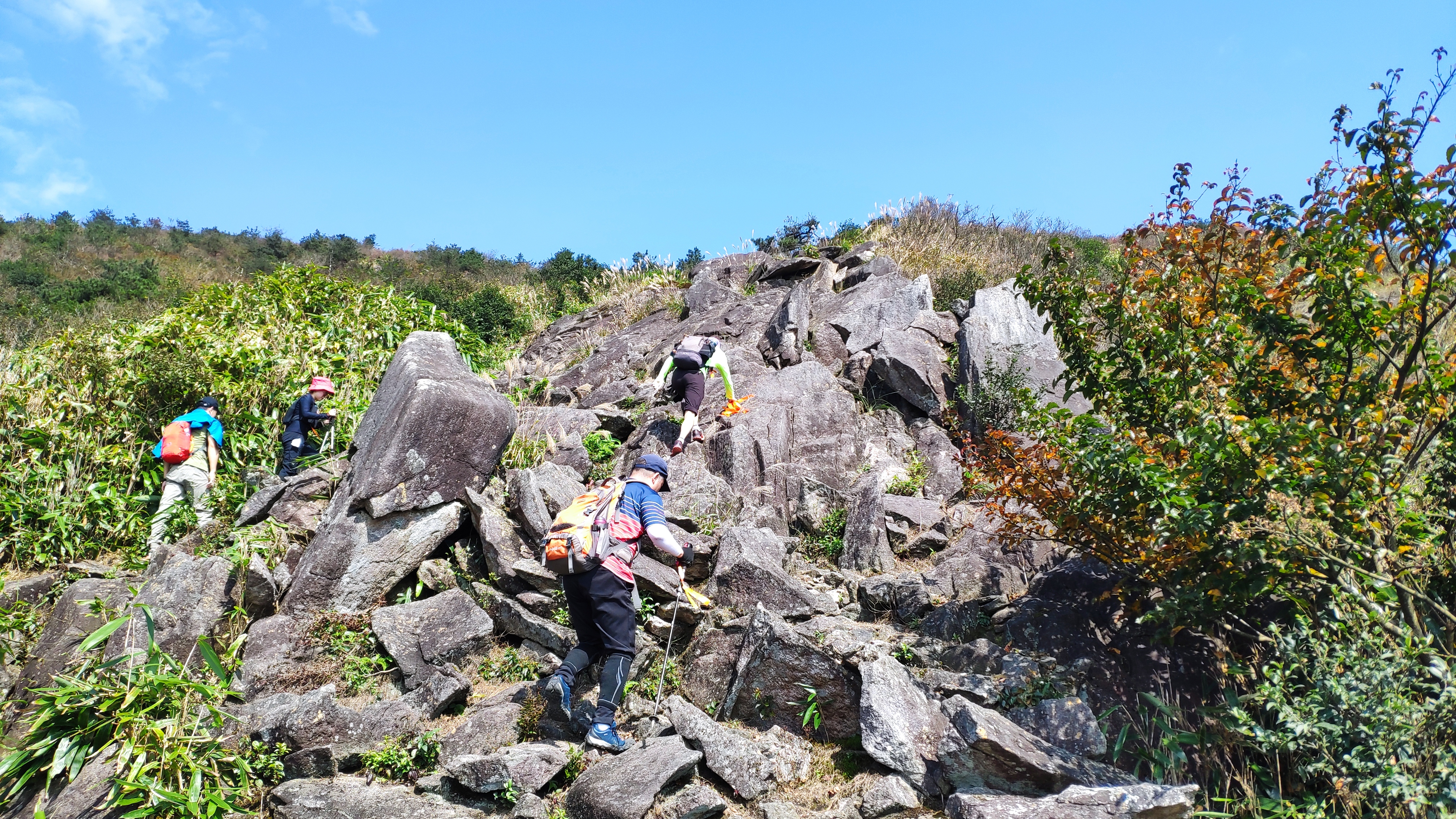 随即,我们又开始了攀爬。户外巡山嘛,就是上上下下,人生之路亦如斯——上上下下。这段攀爬路,连同之后的一两公里路,都是有许多凸起的大石块,棱角甚是锋锐的大石块。当我又一次感叹行路难时,忽然发现,五位小伙伴,化身了奥特曼,他们竟有如此神奇的力量,迅速地翻上了这个山坡。奥特曼们,带带我呀。