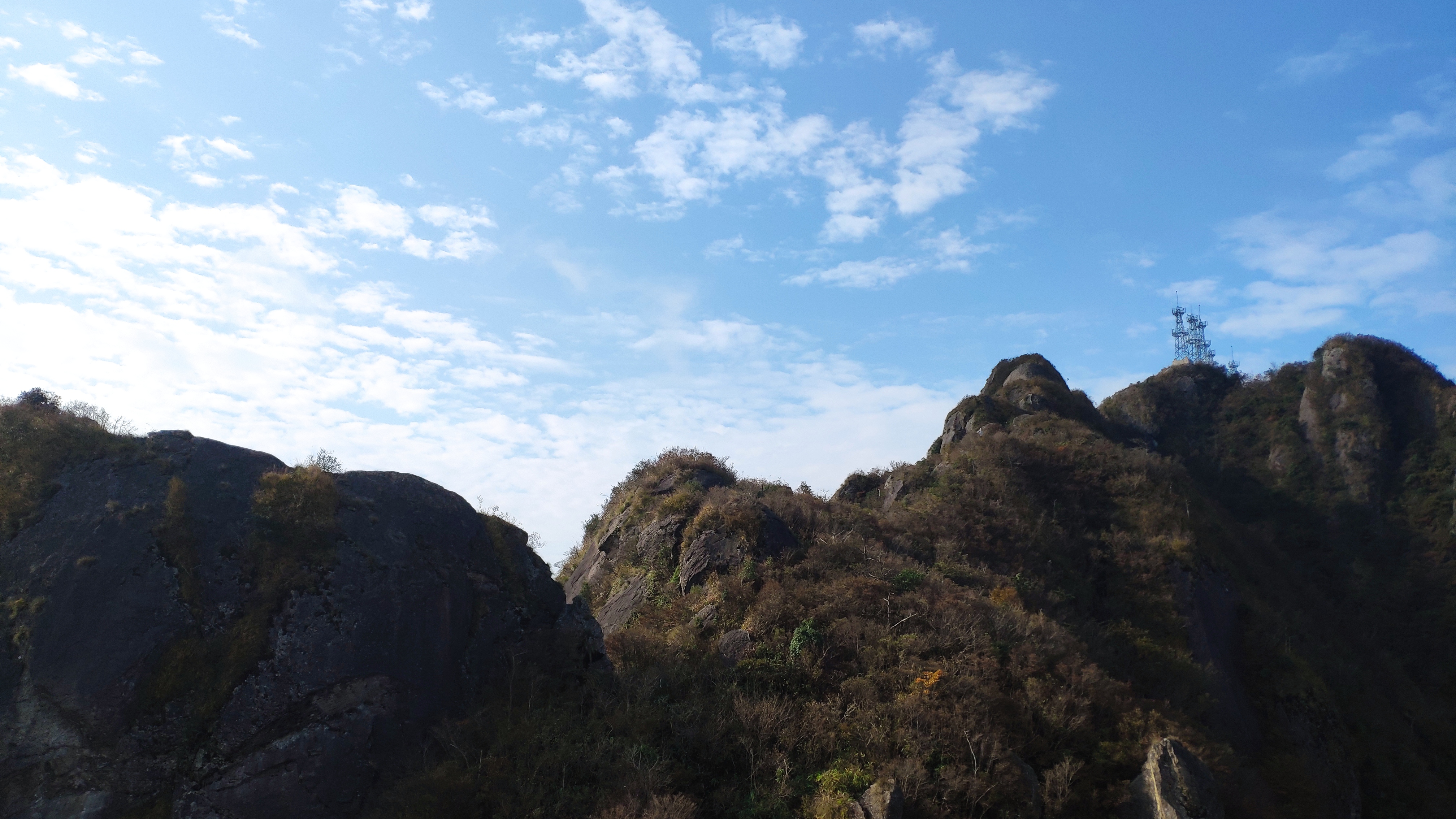 大约9点时,行走了8km的我们,终于登顶乌岩尖。据说,远观其岩石呈紫黑色,故得此名。山尖之上,修建有高压电塔,却没有一处碑,以至于我都不知道它就是乌岩尖,直至后来遇到领队后才得知。不过呢,知道不知道并不重要,重要的是我已来过。正如同天空没有鸟儿留下的痕迹,但鸟儿已经飞过。