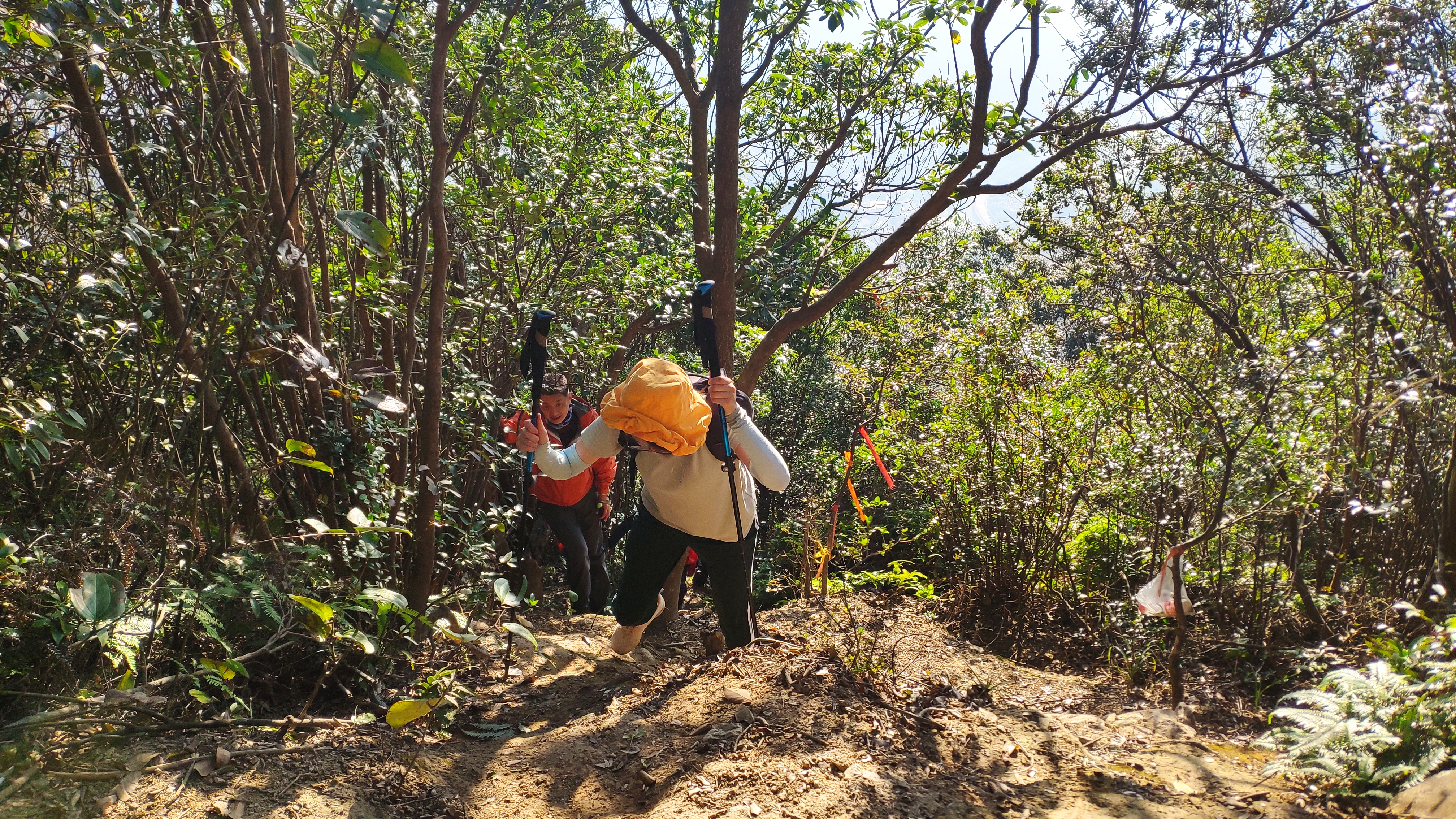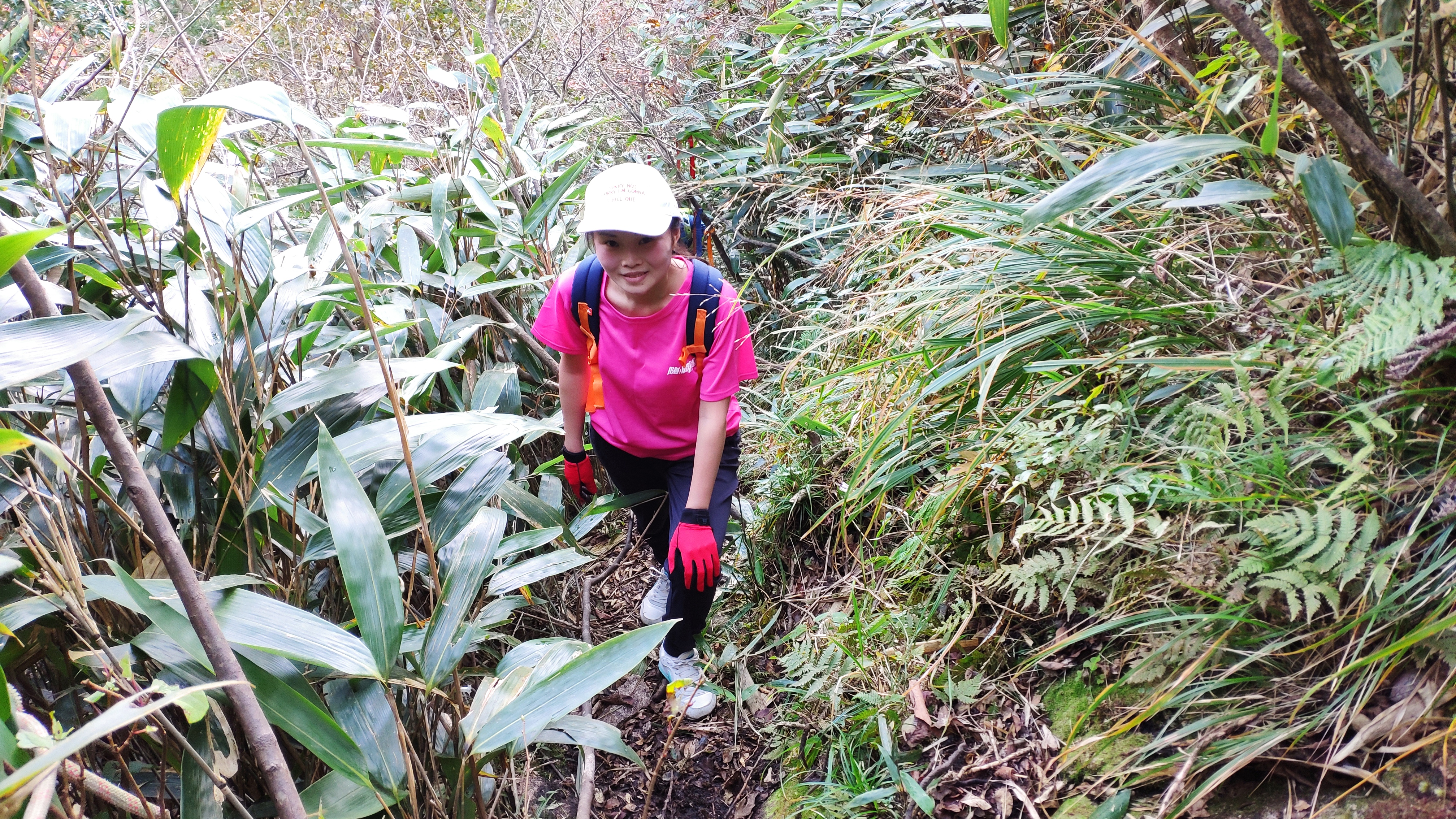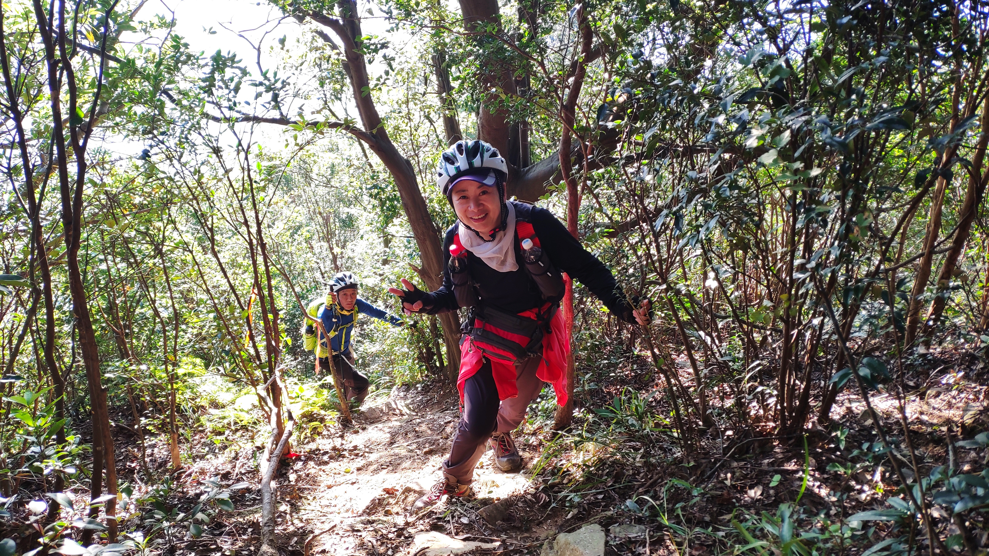 下了小山尖之后,继续赶路。这时,道路变成了在小树林中穿梭,而不变的,是坡度。比起初那段道路好的地方是,我们可以抓树前进,略微轻松一些,也安稳一些。在这里,遇见了来自万里长江第一城四川宜宾市的珠珠,她曾经去了腾格里感受大漠的辽阔,这次又来到了雁荡山追寻大山的雄伟,而相同的,是那颗对户外的热爱与向往。