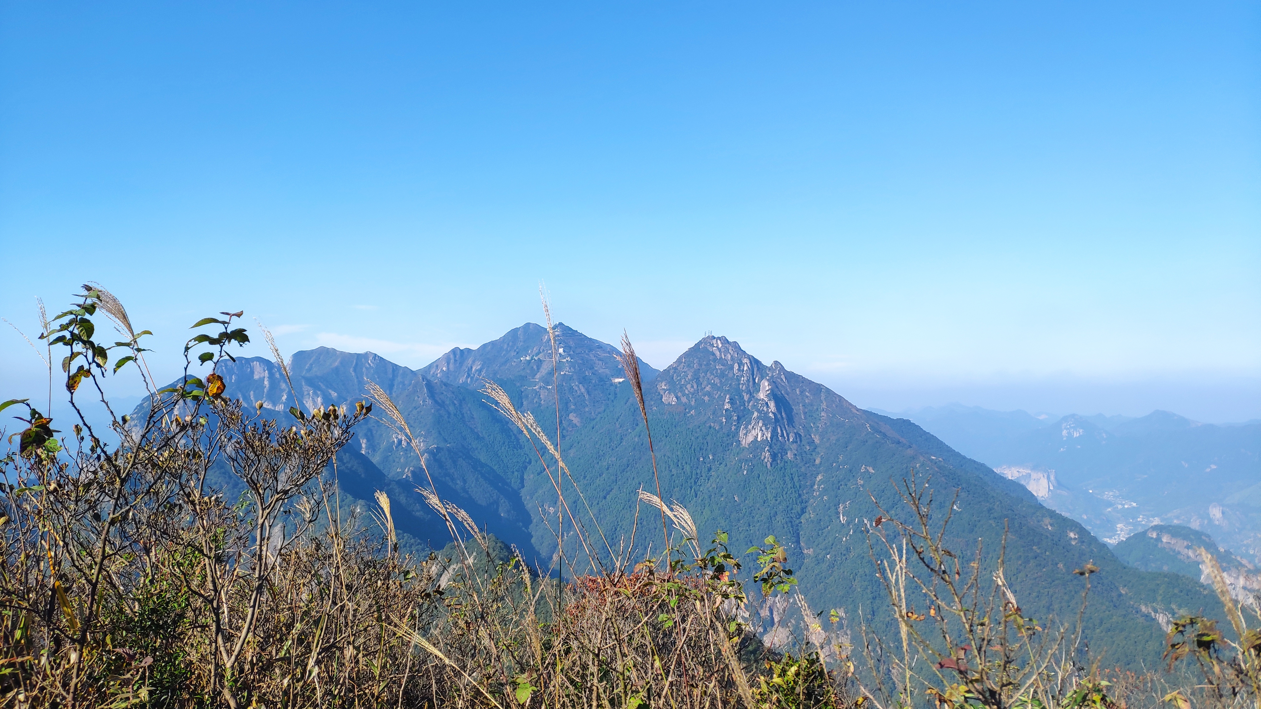 大约10:55时,行走了12km了我们,终于登顶百岗尖西尖,海拔1150m的雁荡山最高峰。万里河山,壮丽风景,尽收眼底。据说,百岗尖的绝景是“百岗云海”,波汹涛涌,变幻无常,可惜我们无缘相汇云海,就在想象中神往下好了。而到了山顶,就是“山峰绝顶我为峰”,此刻的军军大哥、四峰,就是比雁荡山最高峰还高的峰。