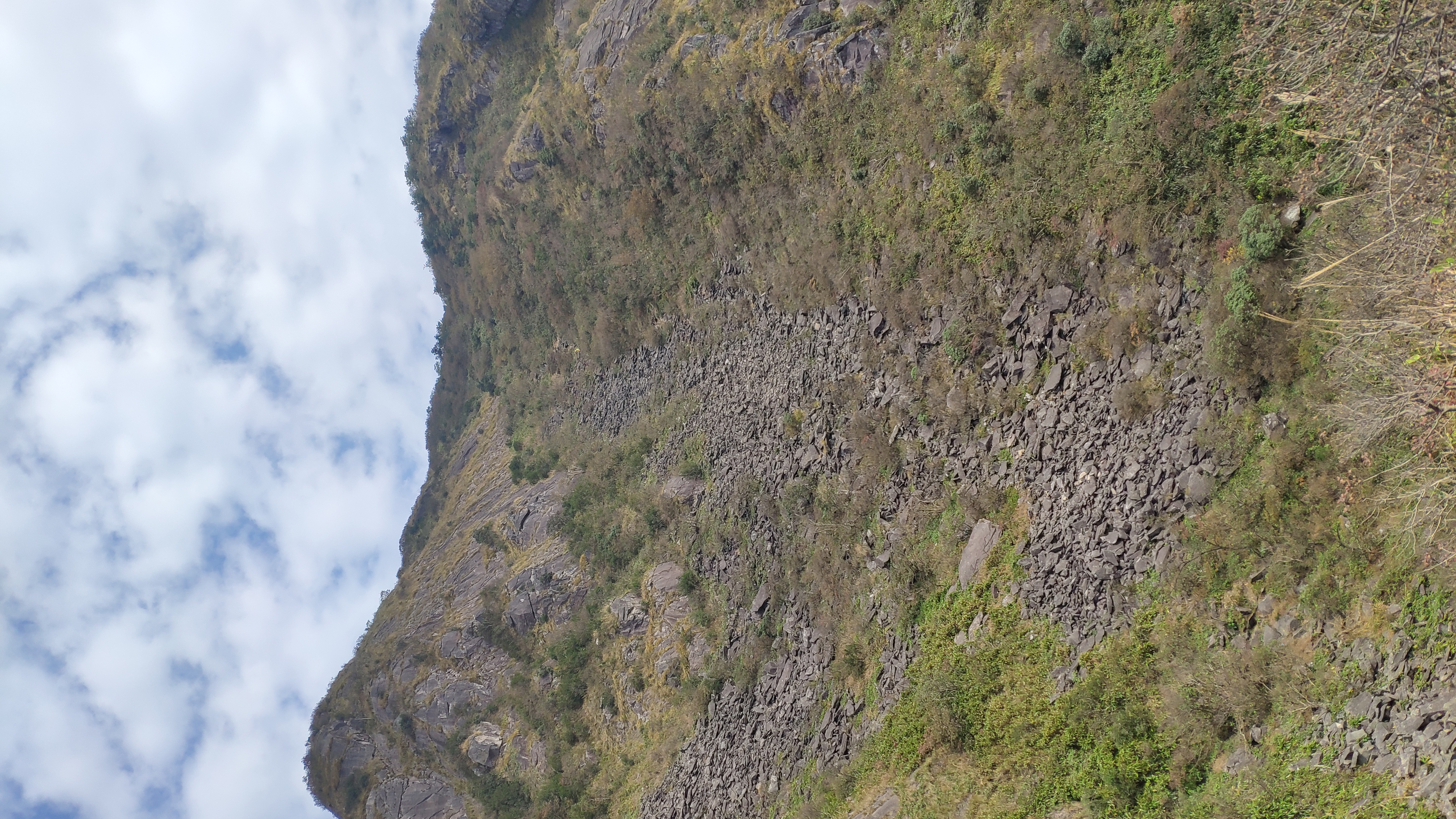大约7:50时,行走了6.5km的我们,不能再轻松行走了。因为,道路明显变陡,大概有三四十度。那先前看到的、远处的山峰,也成为了我们将要攀登的、眼前的山峰。需要小心的是,有些地方还长有苔藓,行走时需要注意脚下,一旦踩到苔藓上就很容易滑倒。路途之中,也遇到了一段怪石嶙峋的道路,起初我还为之惊讶,而见识到后来的路况后,才知道这就是小儿科。不时,会遇到巨大的岩石挡路,我这种“鶸”,得四肢并用才能爬上去。而领队槑,迈开大长腿,轻而易举走了上去,让我好生羡慕。