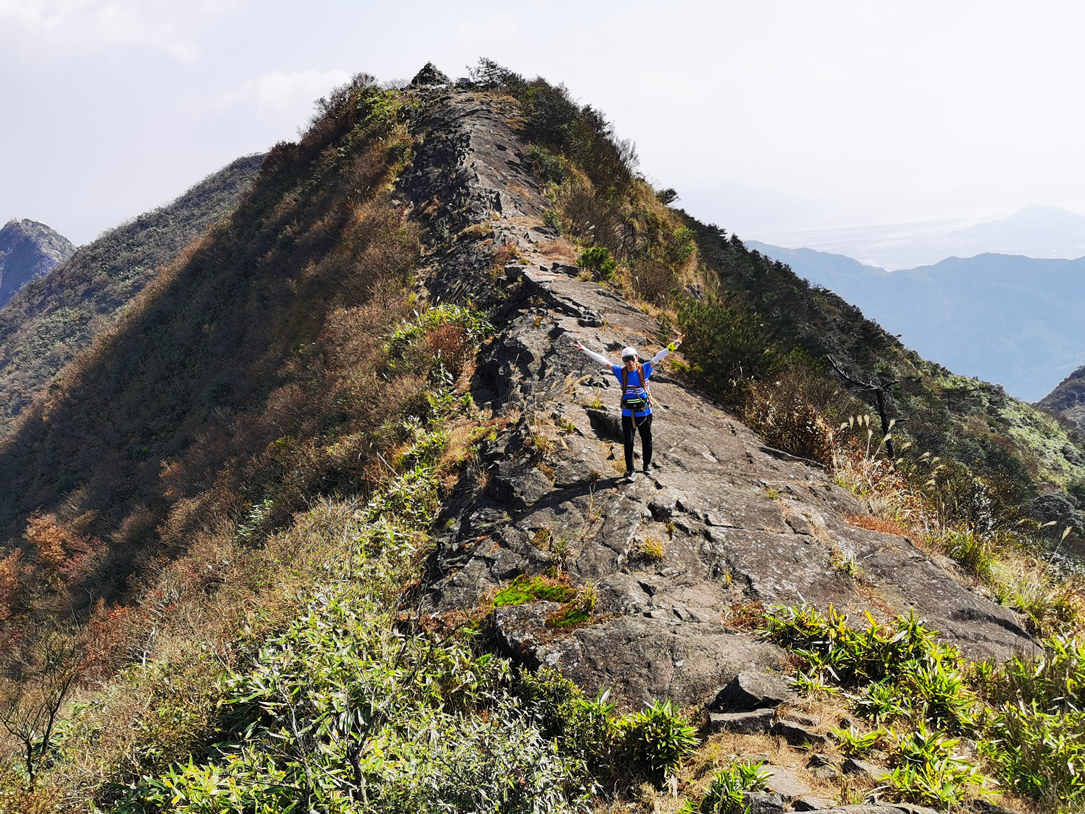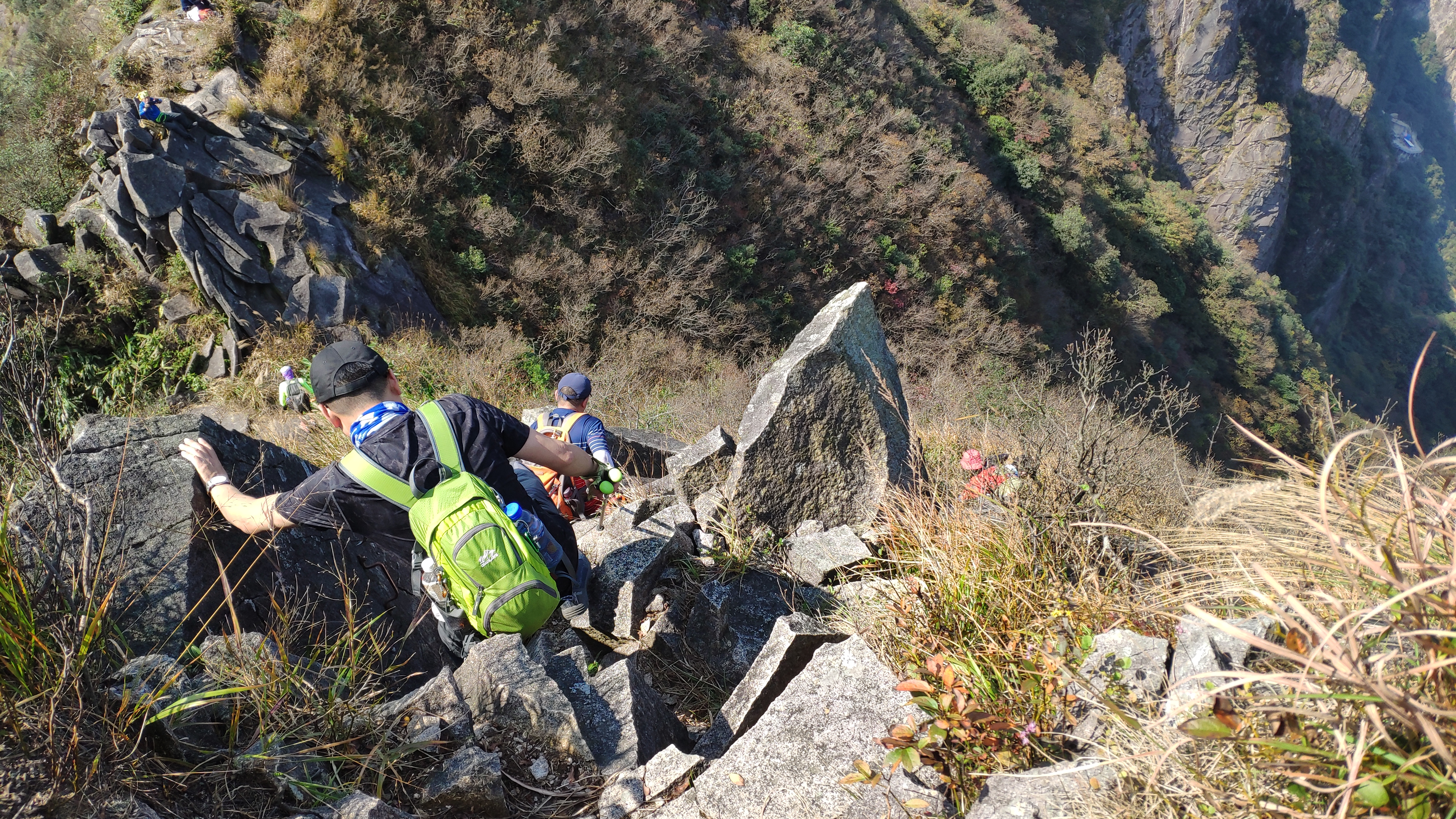 爬上坡后,我们在棱角锋锐的山脊线上继续行走了几百米,于大约11:45时来到了一处下坡。这是一道近似垂直的下坡路,高度大概四五米。来雁荡山之前我查看别人游记时,就为此处的道路胆战心惊。如今,它真真切切呈现在我面前,浑身止不住地瑟瑟发抖起来。待到小伙伴们都下坡之后,我才在小伙伴们的“注目礼”下,小心翼翼地下降。我一方面安抚自己的恐惧心理,一方面小心地寻找凸起石块抓稳、踩稳,终于,平安到达了坡下。随后,继续行走在棱角锋锐的山脊线道路。