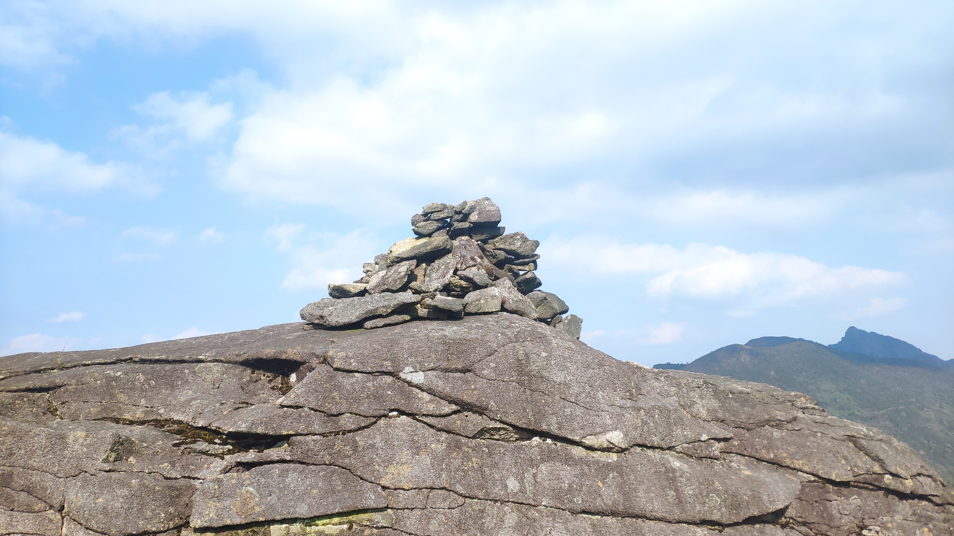 此时,离雁湖尖大概3公里路。眺望远处的一个山尖,心想它应该就是雁湖尖了吧,四峰笑笑不说话,雁荡山亦沉默不语。当我们气喘吁吁爬上刚才所说的山尖后,虽然发现了一个玛尼堆,但并没有雁湖尖的石碑,打开手机一看,雁湖尖还远着呢,我们才走了1km左右而已。这时的我,体力已感觉到了疲惫,而那并不遥远的雁湖尖,我们却迟迟不能到达,心头有了一丝绝望。但既然选择了这条路,我还是和小伙伴们打起精神,相互鼓励,继续向前方走下去。雁湖尖,就在不远处。