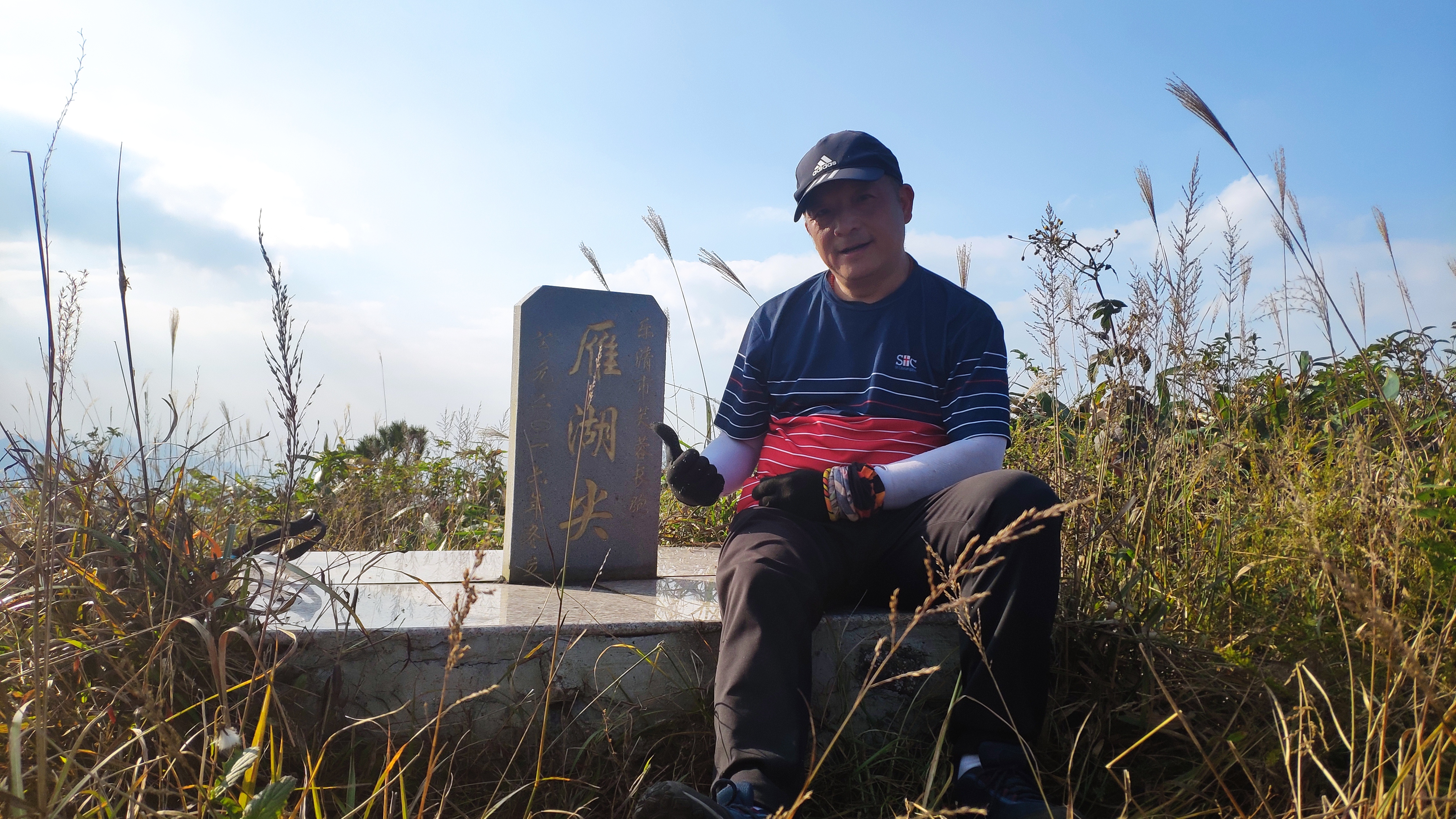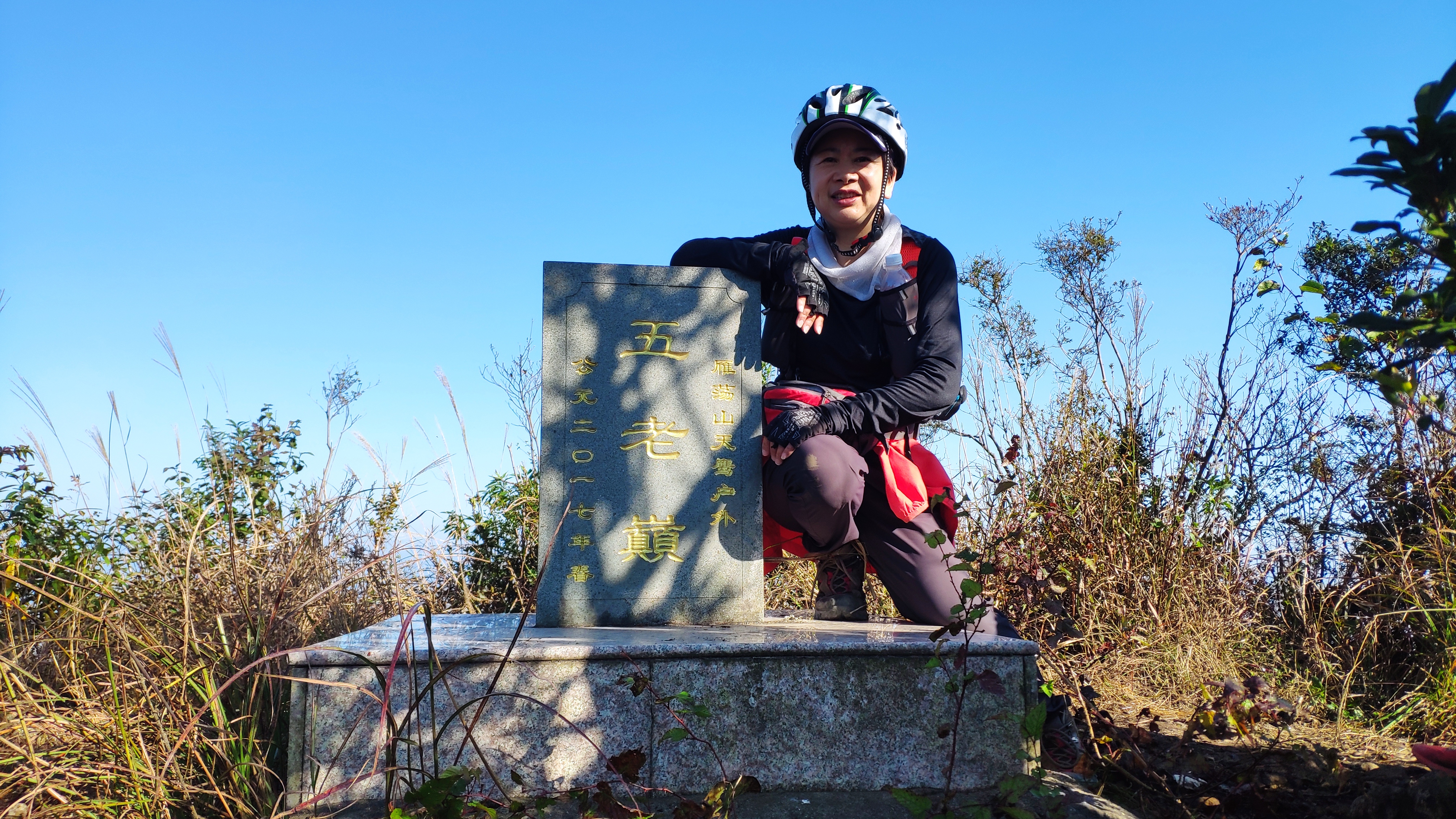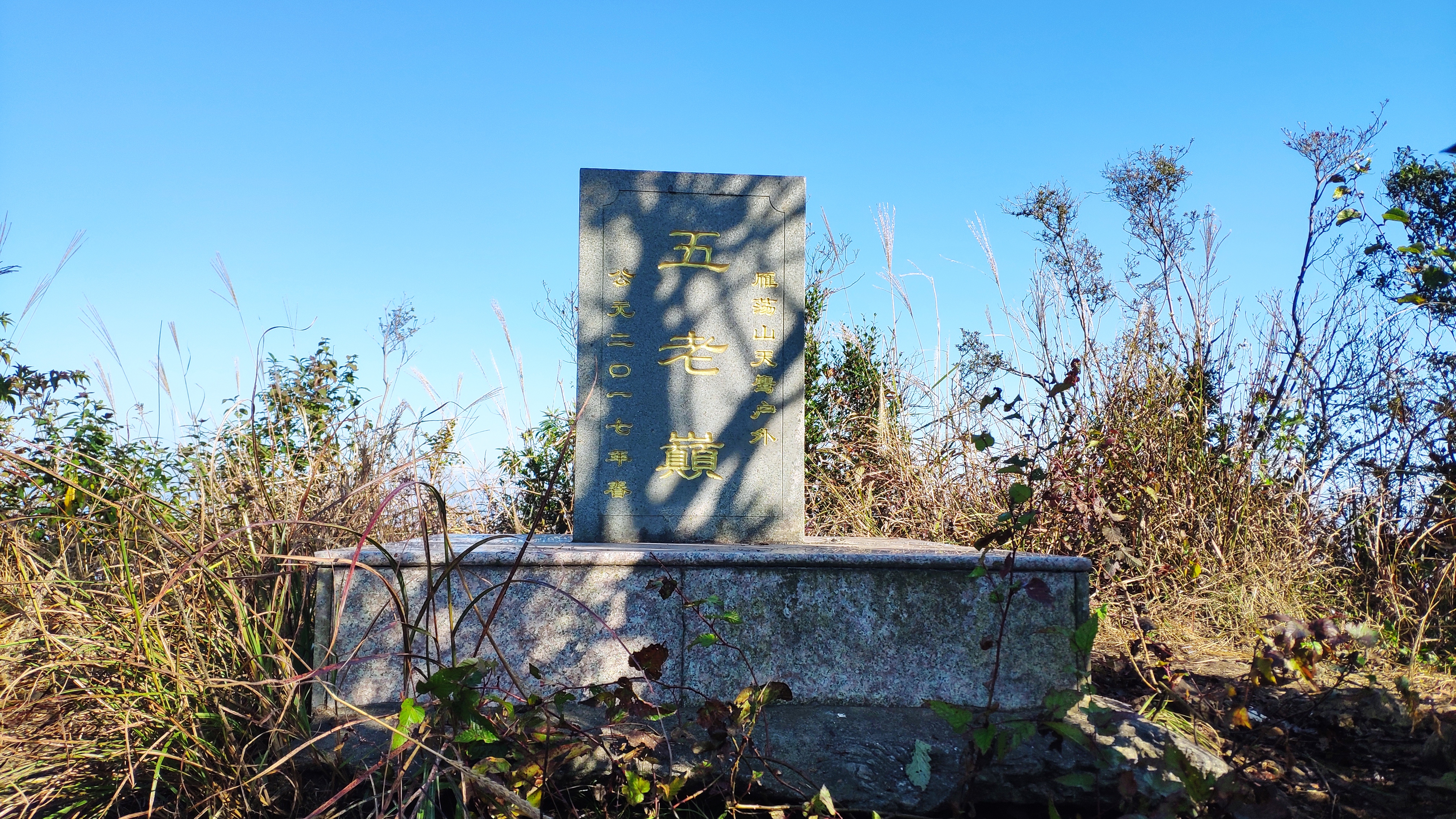 终于,14:55时,行走了17.5km的我们,抵达雁湖尖。乌岩尖、百岗尖、凌云尖、雁湖尖,我们终于全部打卡。雁荡山名字的由来,便是因山顶有湖,芦苇茂密,结草为荡,南归秋雁多宿于此,故名雁荡。我起初以为,雁湖尖上就会有湖,来到此地后,并没有在山顶发现湖的痕迹。据说,雁湖尖的一大奇观是“雁湖日出”,旭日东升,泛金流赤,绚丽多彩。虽看不到湖,虽看不到日出,但已全部打卡雁荡山四大尖的我们,还是非常开心的。