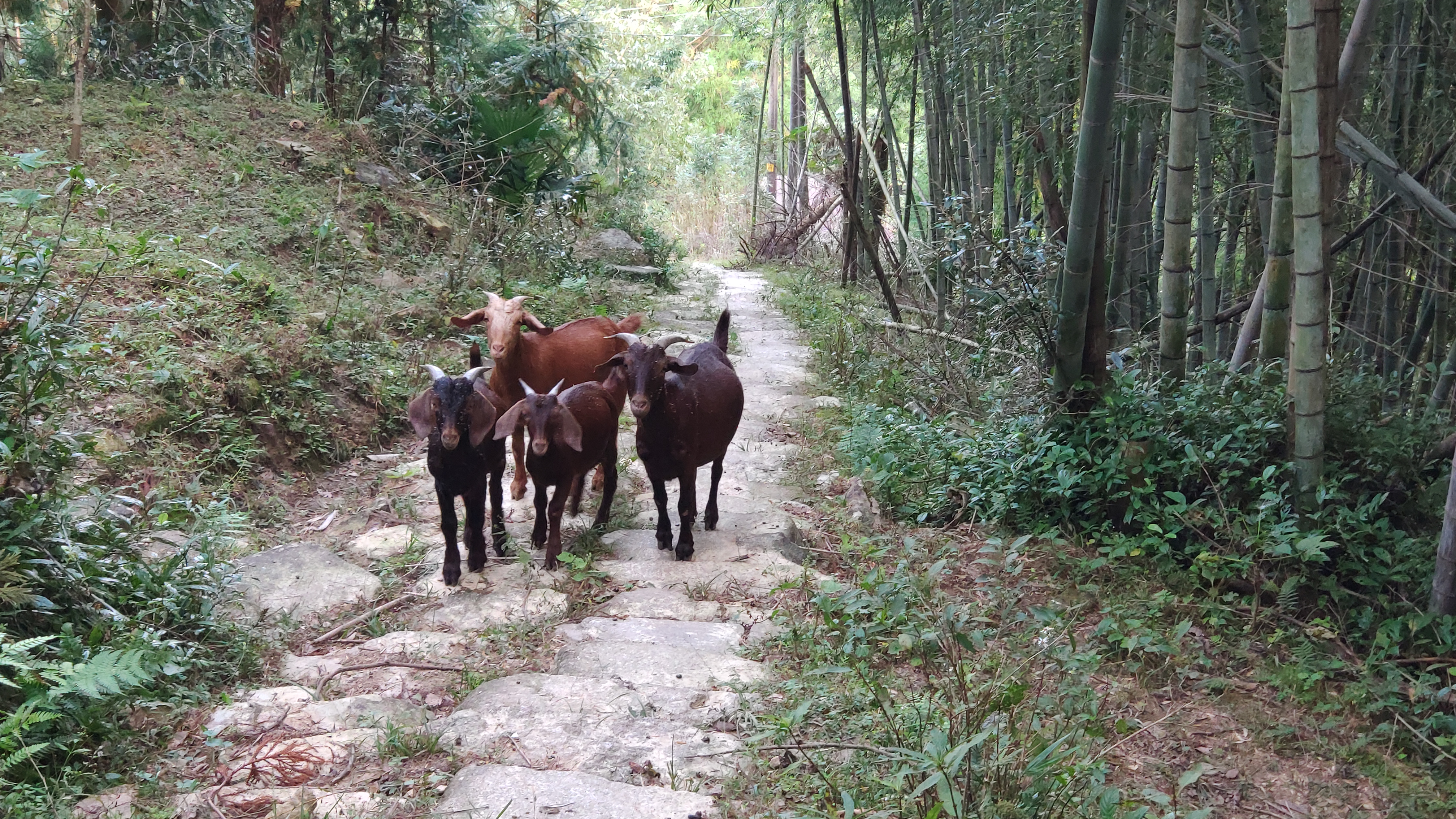 随后,就是差不多5km的下山路了。下山路多为台阶路,临近山脚下时,看到了一群羊,我们确认了下眼神,哦,都是心灵善良的生灵,互相问好后,匆匆告别。