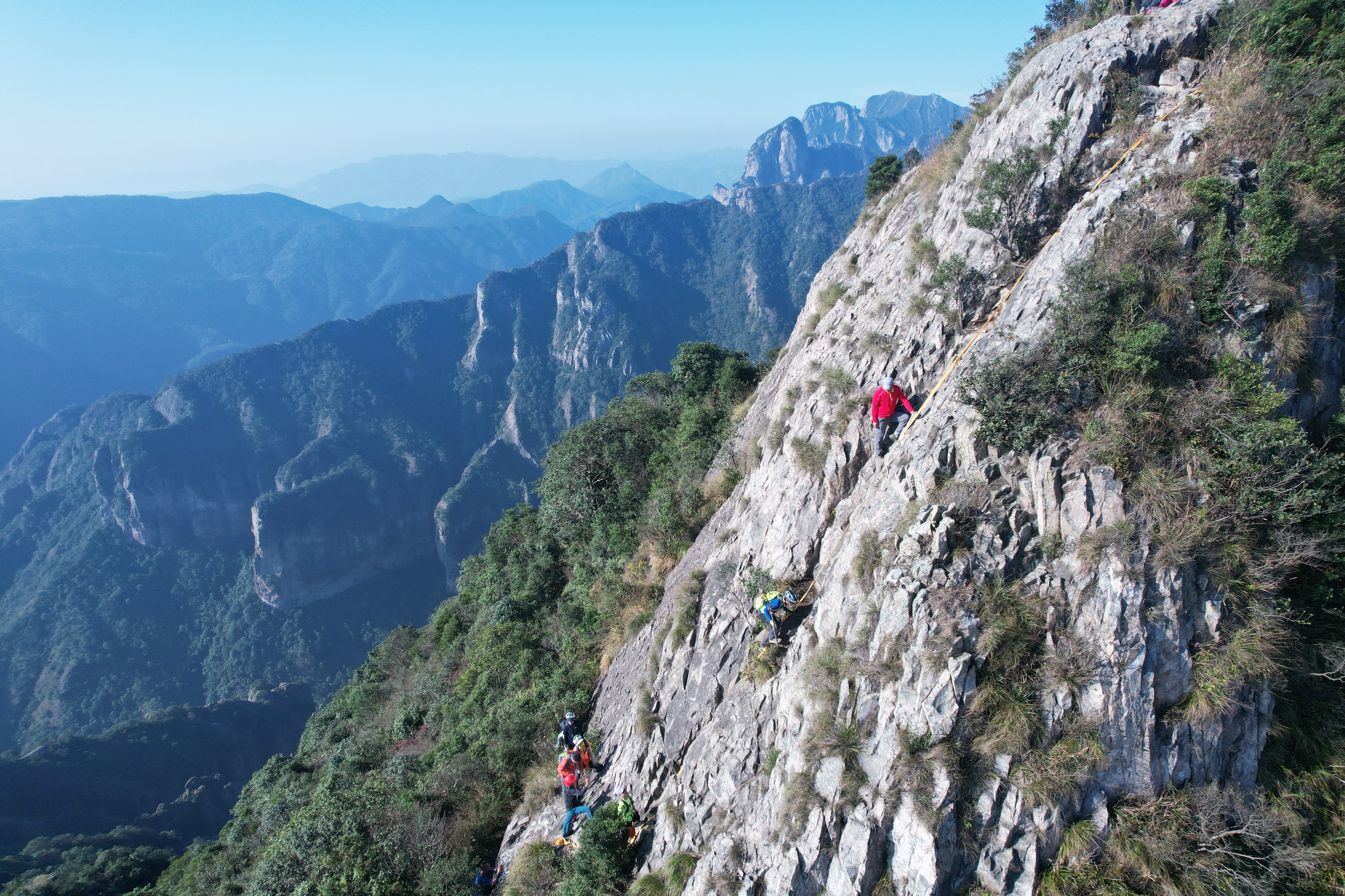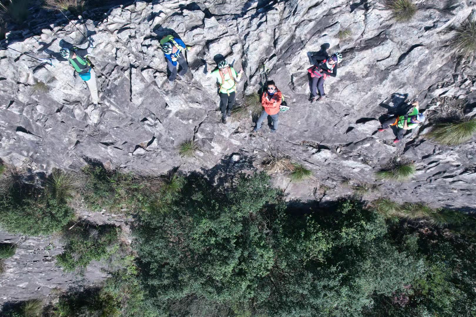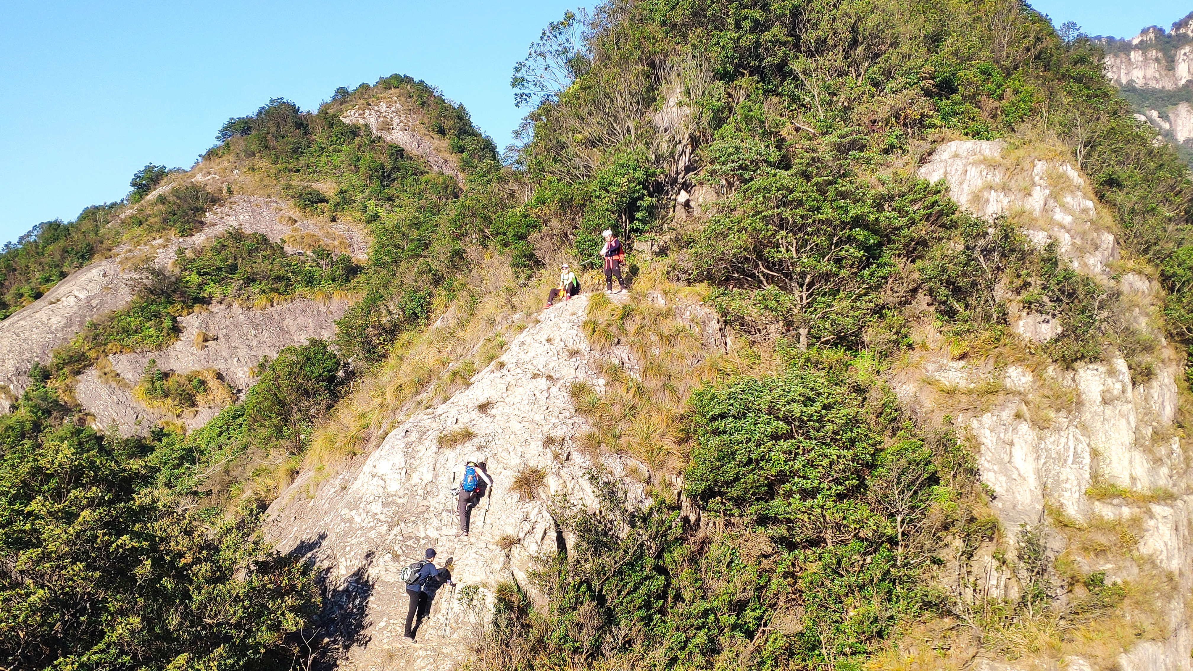 随后,就开始了山脊之上的行走。不多时,来到了鲫鱼背,一条狭窄的山脊线。当四峰听闻村长赶来后,便施展魔法,将我们一行人扣在了崖壁之上,摆出各种造型,在村长的无人机胶片中,镌刻了又一份独特的印记。