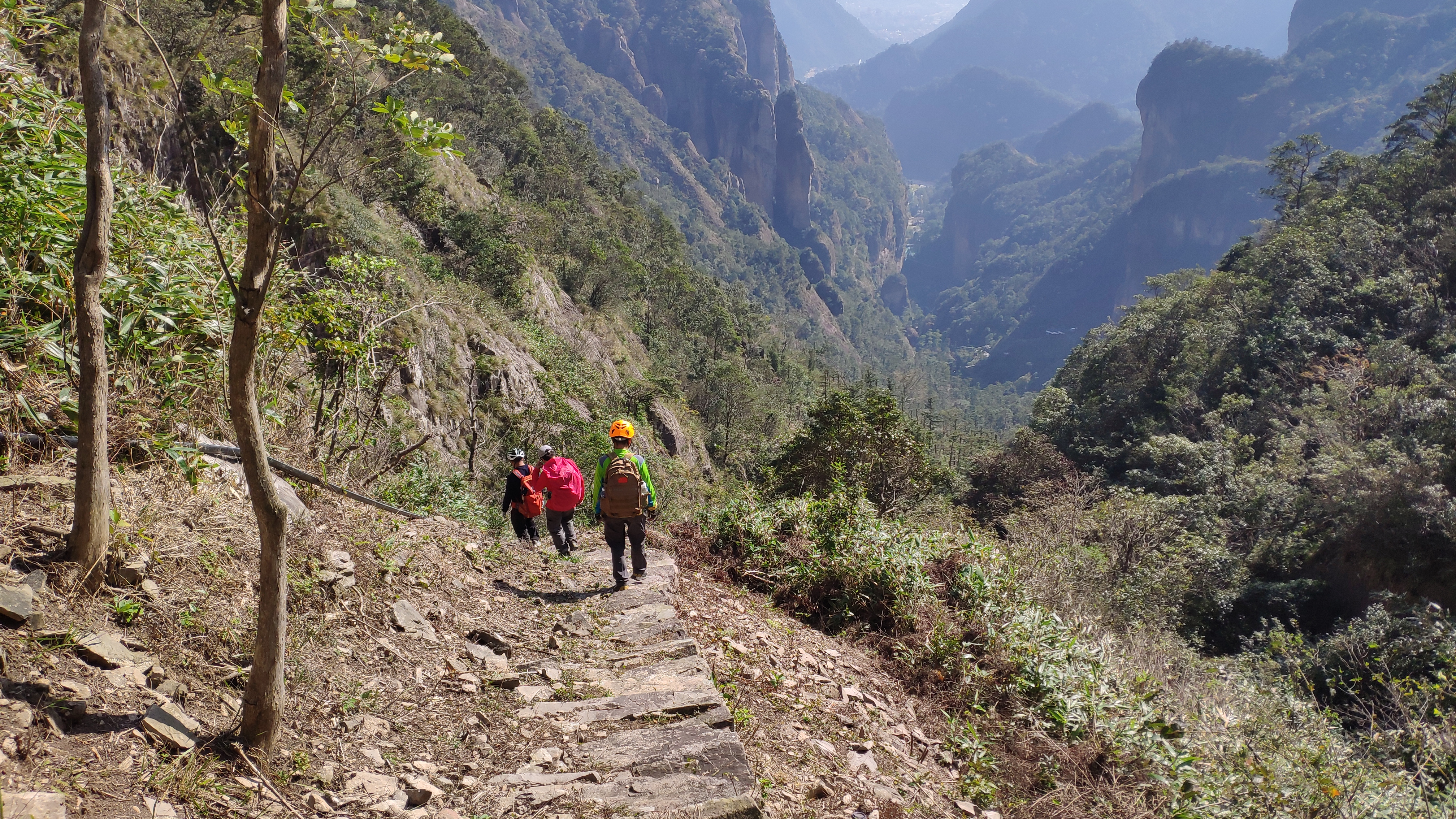 10月30日清晨6:10,22名队员在四峰、槑、心海、蝌蚪四位领队的带领下,开始了五老巅征程。走出响岭头村后,开始了行走台阶路、行走爬坡路。军军大哥和我因为前一天晚上喝了些酒,早上起来后感觉头略有些昏,因此这天在队尾慢慢晃悠。这时,千江姐因为担心我们,便放弃了在队首狂飙,选择了和我们一同前行。军军大哥说,千江姐是女神,果然,她气质优雅、待人温和。和千江姐在一块,着实令人如沐春风。
