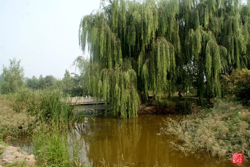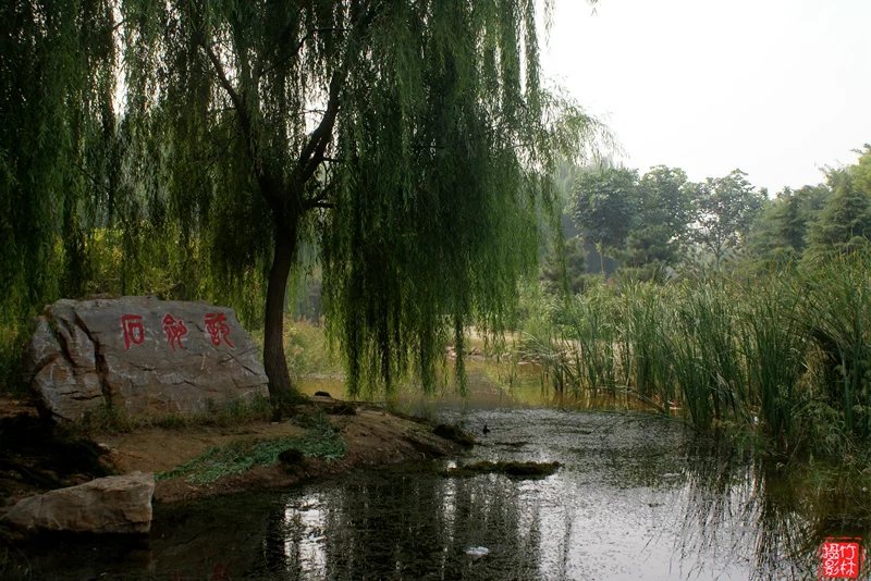 塑像身后是一汪湖水,在阳光的照耀下碧波荡漾,亭台楼阁相映成趣,悠远朦胧,颇有西湖的意境。沿湖右行,走上一座平桥,小桥的护栏上镌刻着“槐水流春”、“灵湫浸月”等八景名胜。桥下细水潺潺在卵石中流动,岸边垂柳婆娑,摇曳风中,这一动一静,把游人引入梦中。