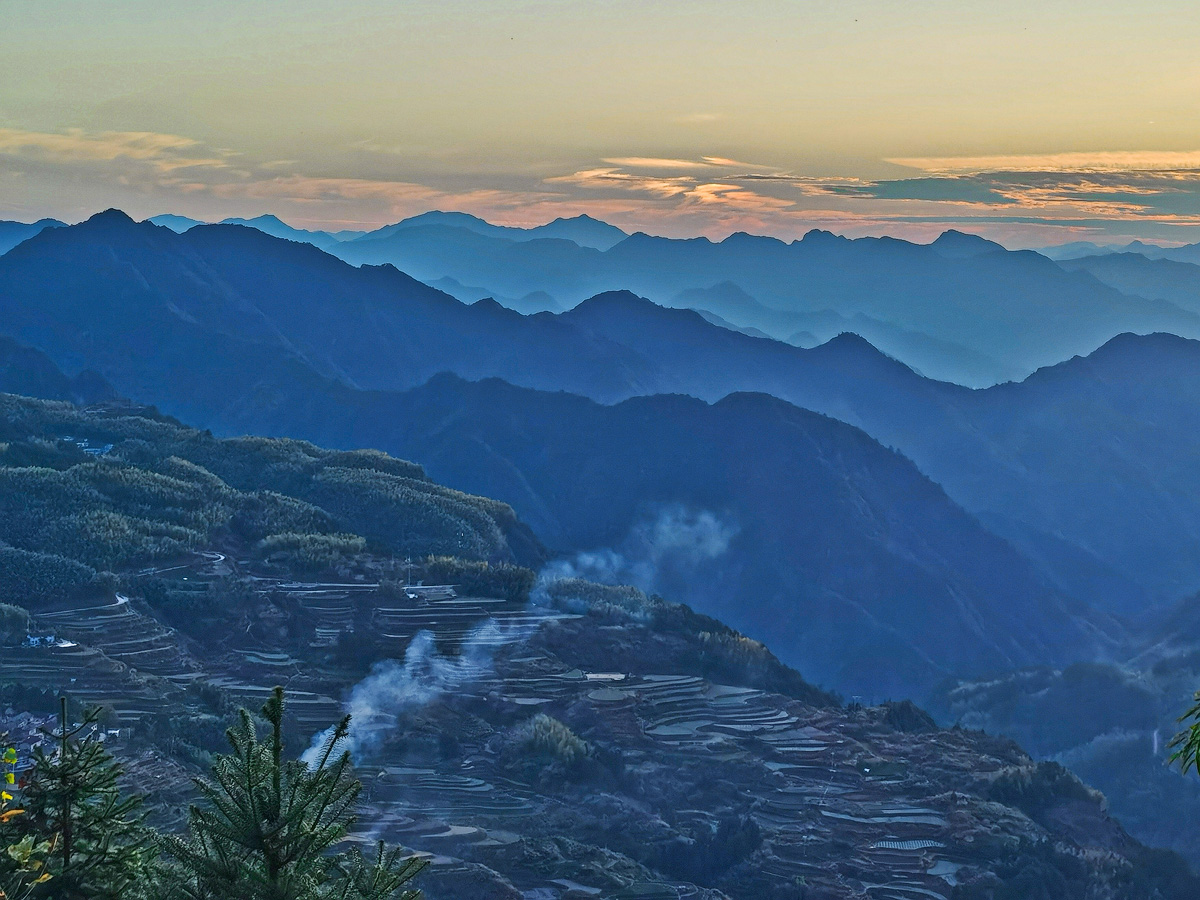 远处的高山一层一层,云雾绵绵长飘,就像波涛一样在山与山的缝隙中翻滚。近处的梯田一级一级向上攀展,竹林下一处小小村落,炊烟袅袅与云相接,似有饭香飘了过来。