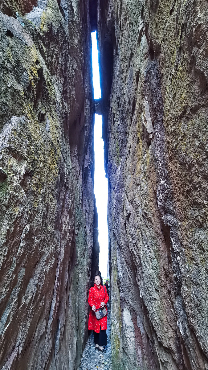 这里我们看到了有名的一线天。在两个山峰之间留出了一道细细长长的缝隙,只能一个人过。两山夹缝如此窄小,仰头看天如一根细线,正所谓“云里石头开锦缝,从来不许嵌斜阳。何人仰见通宵路,一尺青天万丈长”。这条亿万年“缝隙”,正是南尖岩的著名景点“一线天。”