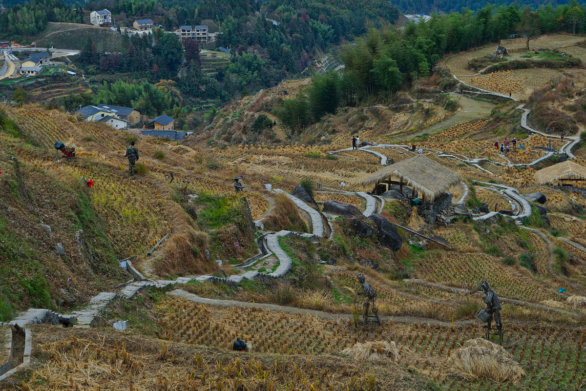 梯田最早开发于唐,兴于元、明,距今1000多年来,已形成湿地面积2192余公顷,其中稻田面积840余公顷。这里显示着世代劳动人民的智慧和勤劳----在这一片山坡之上,层层叠叠最多处达700多层的梯田之上,把水留住,构成了千百年来以农耕稻作为核心的湿地生态。这个景点叫九曲云环,是整个 云和 梯田的核心地带和最佳观景点。还有有趣的“稻草人”,“稻草青蛙”。