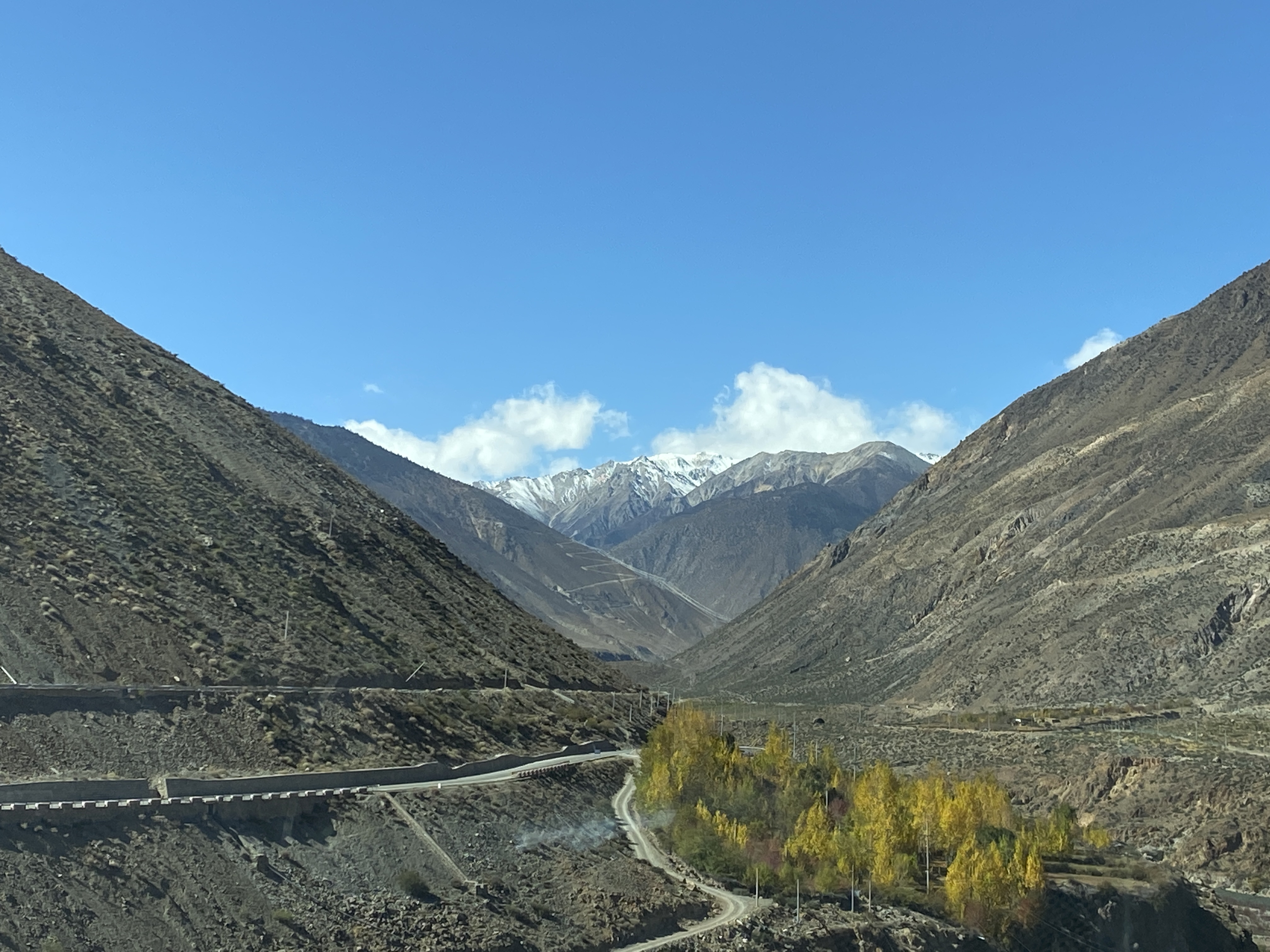 去然乌湖的路上。据说然乌湖的色彩非常丰富,草地、森林、秋叶以及白色的水禽和湖岸全滩五颜六色的卵石,清新如镜面反映。然乌湖的湖边是一大片碧草如茵的草甸,和着碧蓝的湖水、白雪皑皑的雪峰,景色如诗如画。狭长的阿木错湖向西蜿蜒十余千米逐渐收缩成一道河谷,随季节的不同 ,河水也呈现出或碧蓝或青绿等数种颜色。河道中许多岩石和小岛点缀其间,湖面上春季树影婆娑秋冬薄雾弥漫,四季美景都会使人如进梦幻之境。