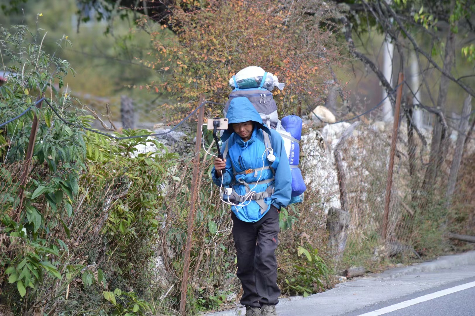 林芝雪山下。318国道路旁。路遇一徒步的兄弟。