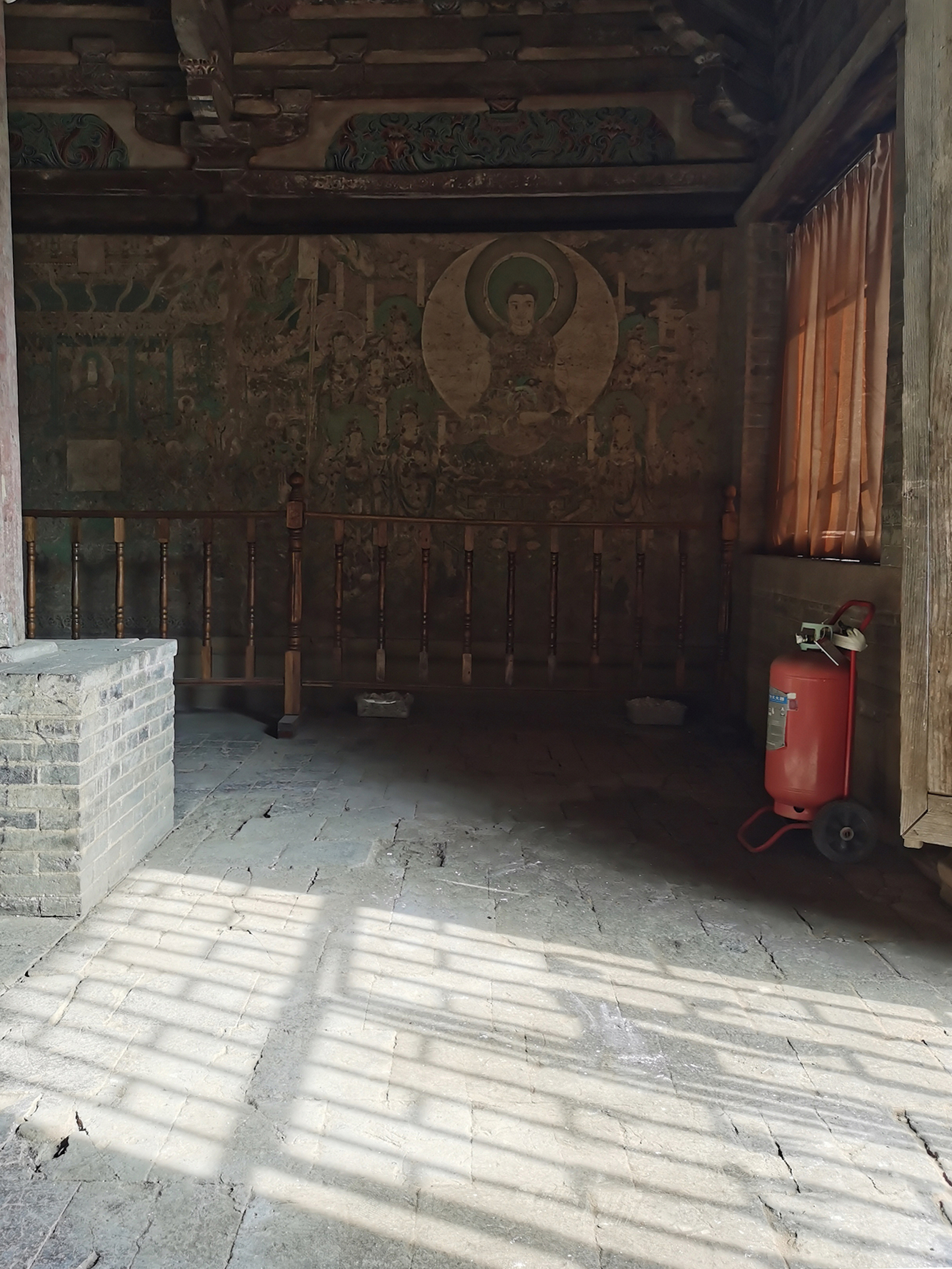 (佛祖袈裟上亮闪闪的是金箔,原来壁画上用到很多,但都被人撬下来偷走了,留下斑驳的墙体)