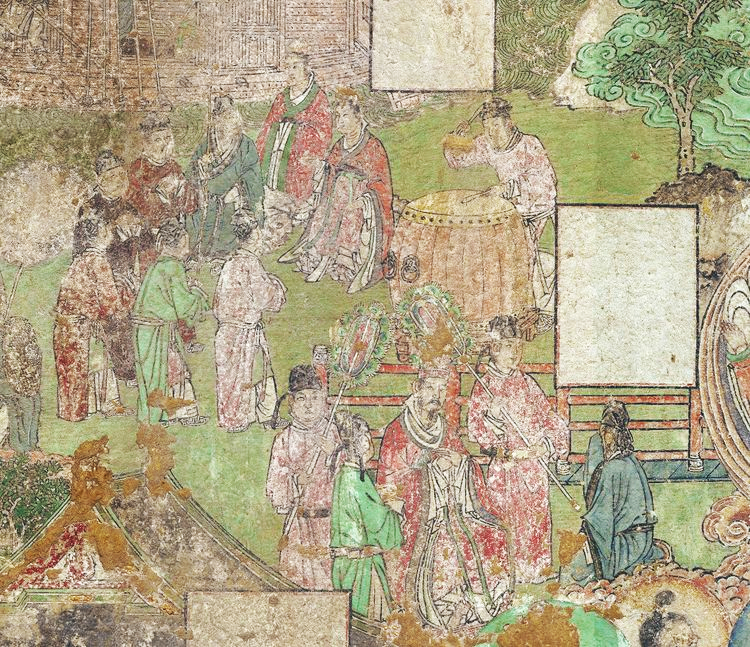 整铺壁画最吸引人的是它的色彩,雅致的青绿底色,给人一种徐徐道来的感觉,流畅的线条勾勒出数百个形形色色的人物,写其形传其神,传其神写其心