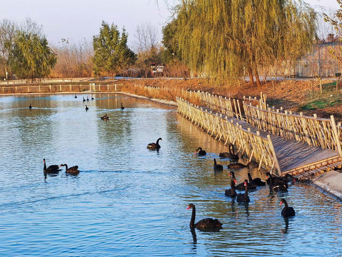 天鹅湖畔的生灵们,成群结伴,无惧寒冷,嬉戏于风雨中,生动了宁静的湖面。百鸟与阳光齐舞,和着无声的天籁,融于金装素裹的湖面间。