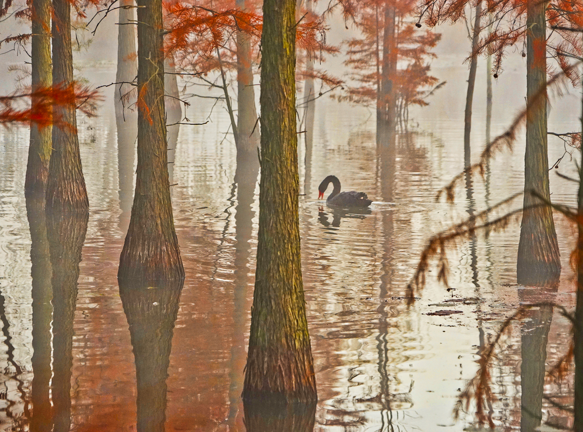 有位网友对池杉湖的评价:“一个宁静而又充满生机的原生态之地。” 除了心灵的净化,这里还是一个能让人感受到一份爱情的地方。“蒹葭苍苍,白露为霜。所谓伊人,在水一方”----看这一对如影相随的黑天鹅吧!
