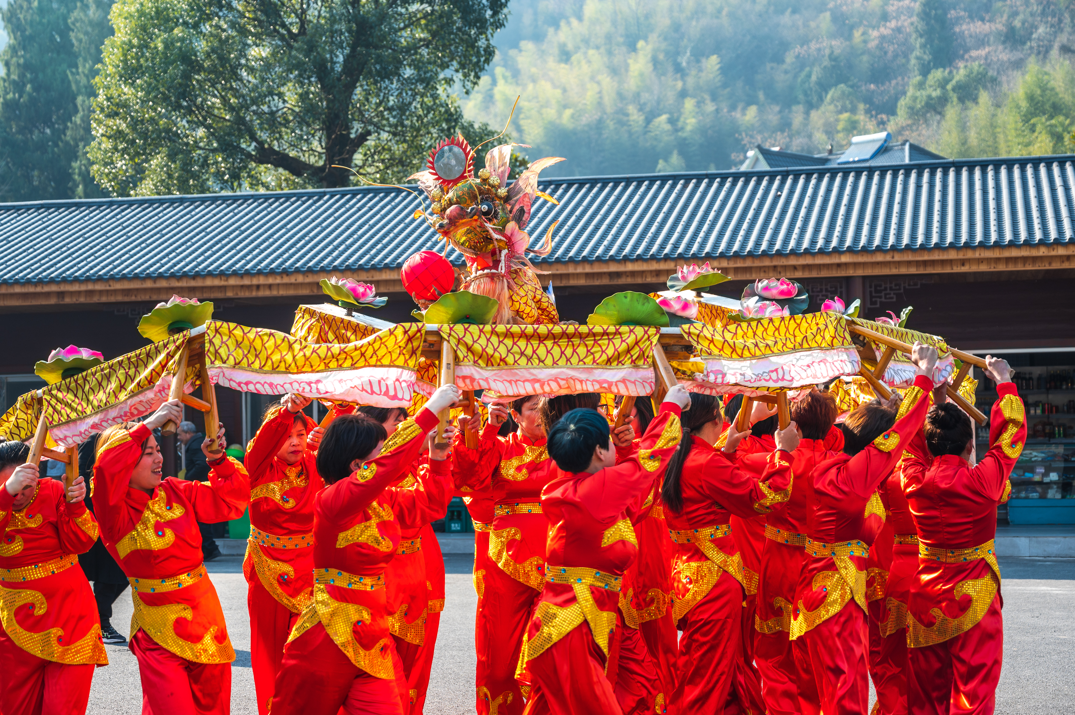 女子板凳龙表演时,场面非常壮观、热闹、喜庆,只见她们时而变换着队形,蜿蜒的长龙节节相随、时起时落、穿来摆去,时而聚集在一起将龙头高高举起,回眸一望,内心激动而又瞬间肃穆,作为中华儿女、龙的传人,我们应为继承和发扬中华民族精神而不懈奋斗!