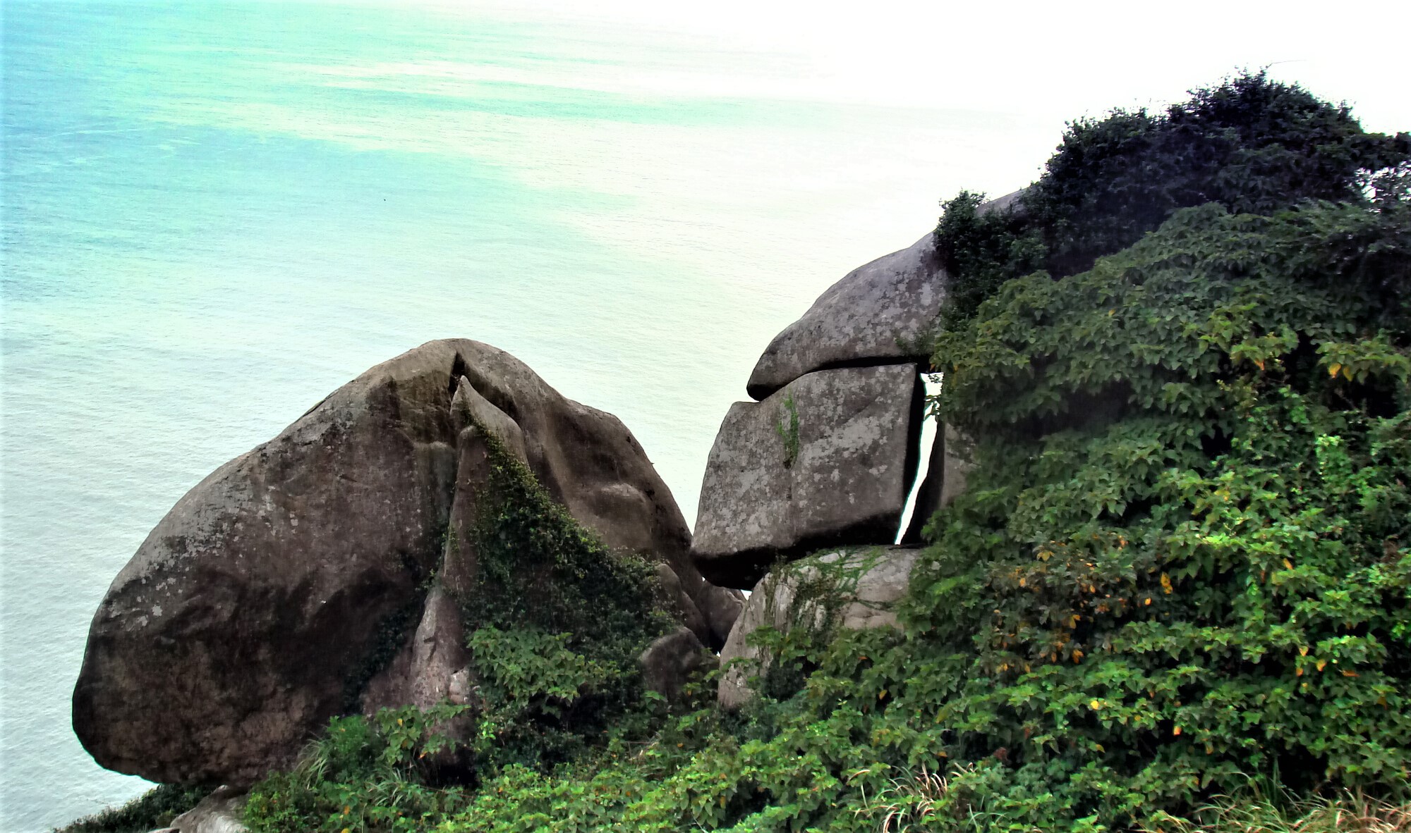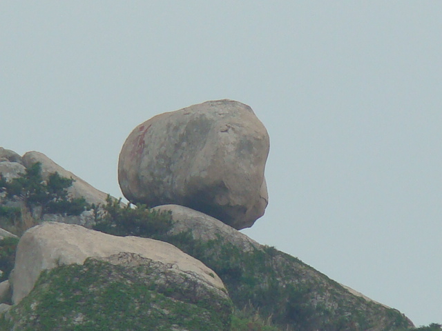 有的岩石风化开裂后,不成片状,而是形成园型的石球或石块。有的还处于斜坡之上,一幅就要滚下坡的险样。当然,也不是所有岩石都能风化成球形的,而是由其内在的因素决定的。我曾在岛上看到一处岩层,其内部的纹理就是成园形的,这样风化后就会形成球状石块。