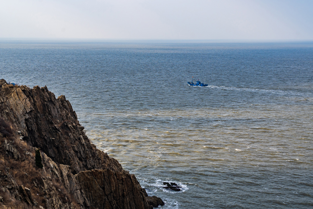 一艘渔船出港了,驶向了海的深处,乘风破浪,一会儿就不见了踪影,这青黄相汇的黄渤海交界线,你一定要来看一看。