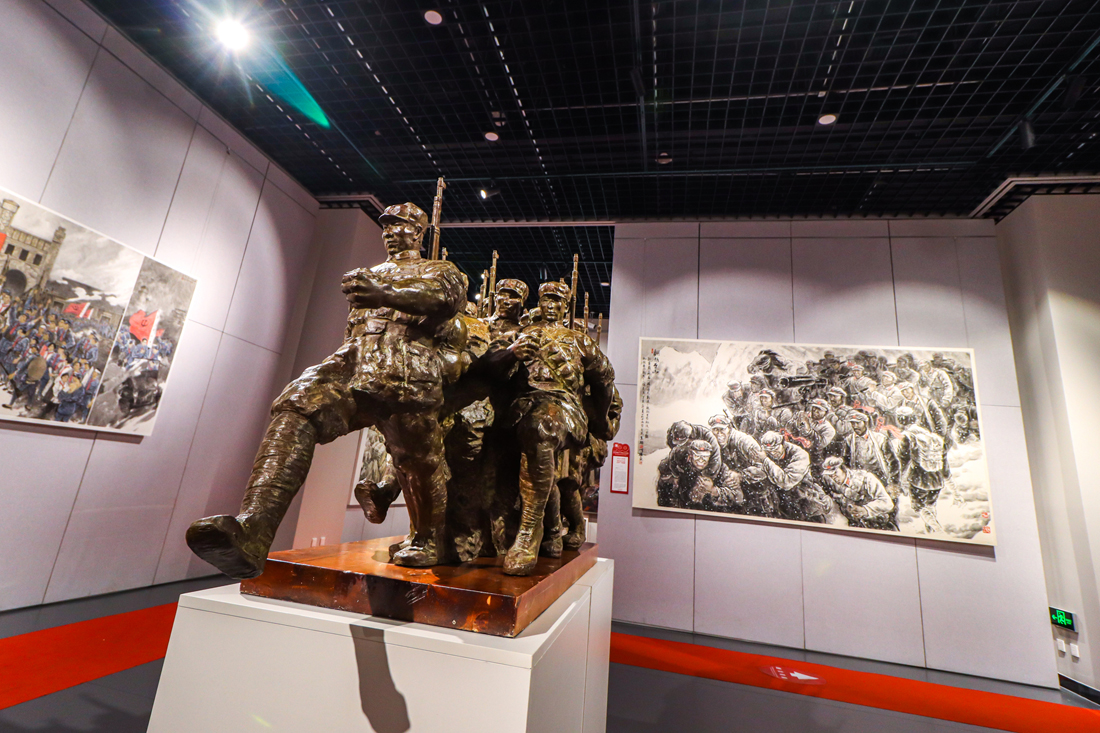 在特展左侧的展厅,还有大连的“百年奋斗 光辉历程”大型主题美术创作工程作品展,在这里你可以看艺术家用绘画和雕塑的表现形式,记录和创作属于大连人自己的百年历程,新世纪新生活的美好景象。