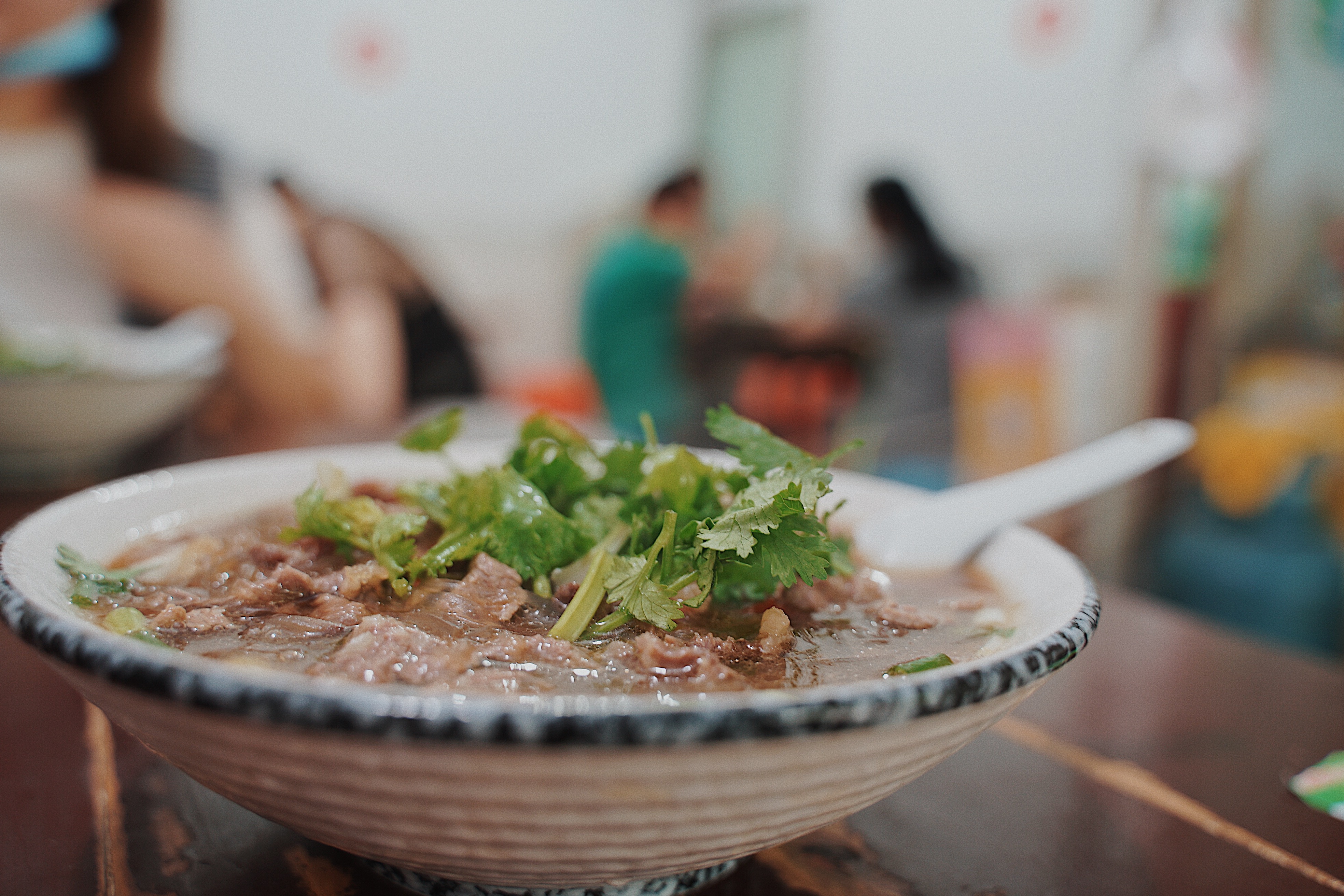 牛肉细嫩,刚出锅时呈现出将熟未熟的粉红色,在汤中再浸一会就已完全熟透,但稚嫩的口感还在。手中的筷子上下翻落之中,一碗热气腾腾的面已不知不觉下肚了。总要吃到汗流浃背心满意足,然后面带微笑地走出小店,擦擦额头的汗珠,正式开始一天的生活。