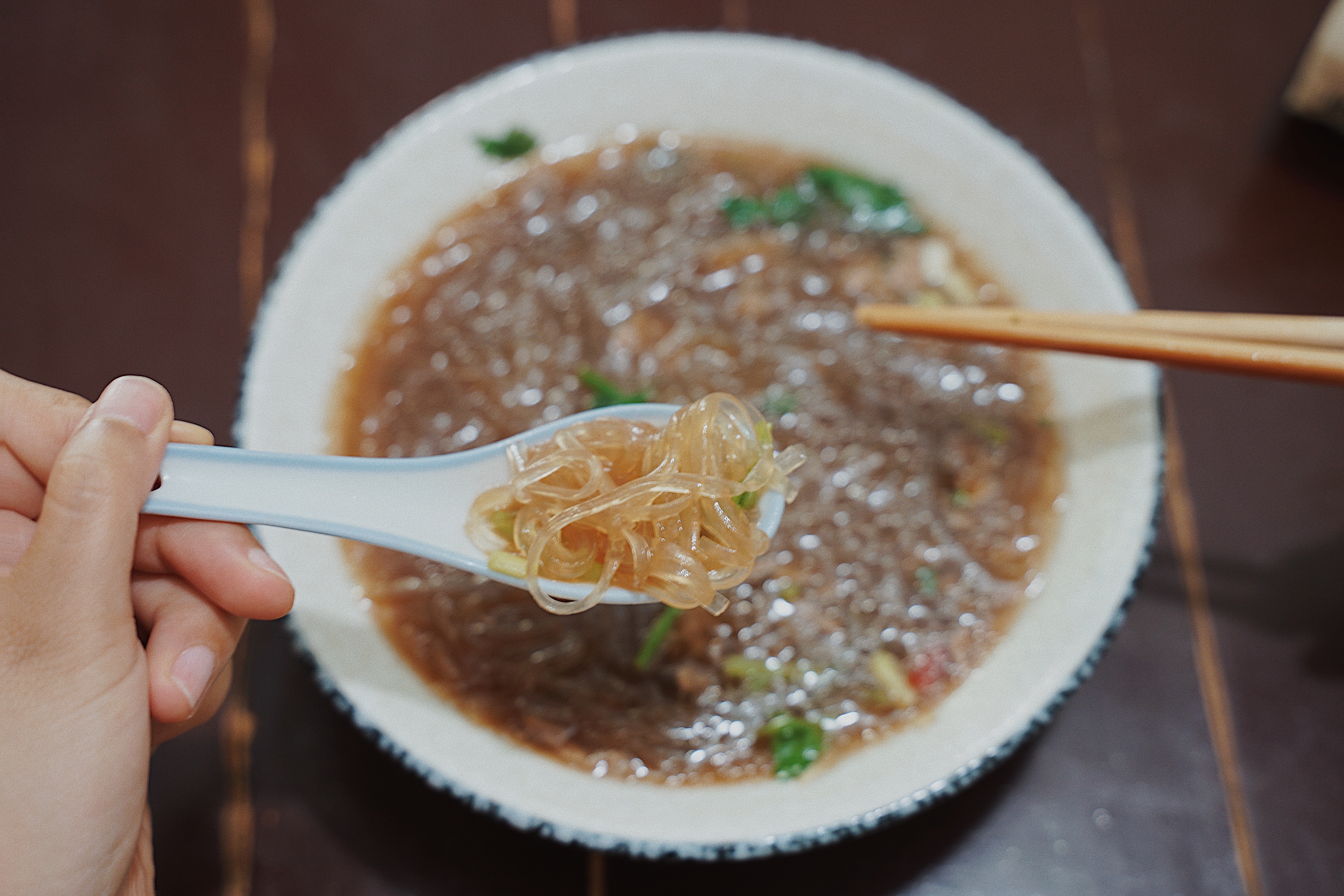 第一口先喝汤,汤底入口是令人惊喜的醇厚鲜美。干面其实并不是面条,而是当地叫法的红薯粉丝,提前泡发后煮得软软地,裹满了汤汁。用筷子一夹,已经无法保持整根的形状,断裂成一节节的。正是因为这样,一筷子夹起来的众多的粉丝段聚集在一起,他们之间被浓厚的汤汁紧密相连,让面与汤汁于是完美相融,送入口中一同绽放出舌尖上的花来。