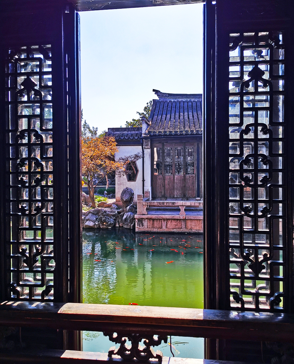 不论建筑规模大小, 江南 民居都体现出一个与北方民居的明显区别,就是雕刻装饰极为繁多,却极少彩画,墙用白瓦青灰,木料则为棕黑色,或棕红色等。与北方的绚丽色彩相比十分淡雅。但退思园的花池里锦鲤鱼则是如此鲜艳的!