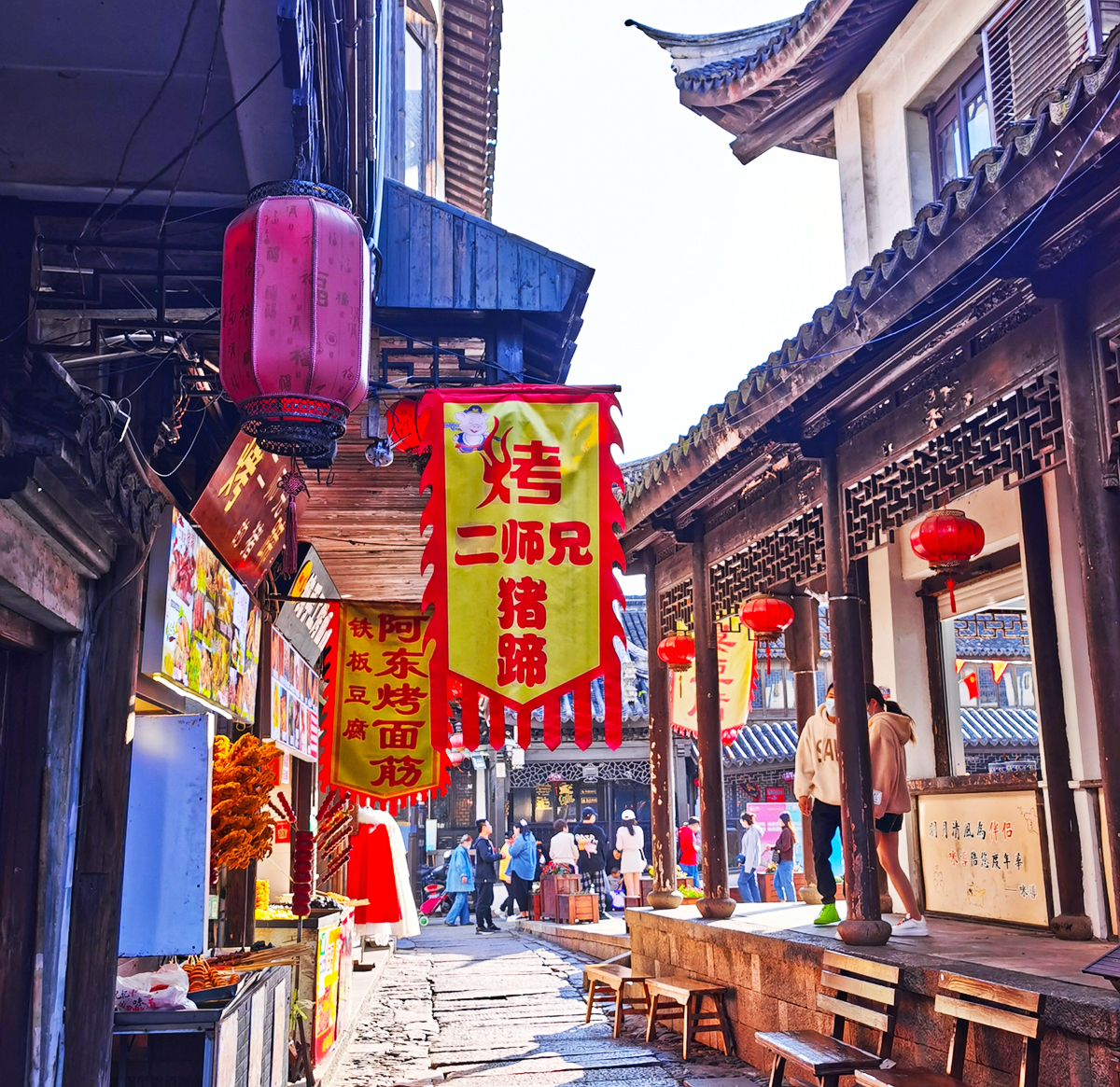 一叶叶小船,穿桥顺水而行,涟漪不停荡起,这是属于当地人自己的光阴故事。大大小小的 亭子间 在上塘街和下塘街都不缺,不怕路边没地方休息。在小店买点吃的,找个临水的位置坐下,可以边吃、边歇、边看船只来往,惬意!