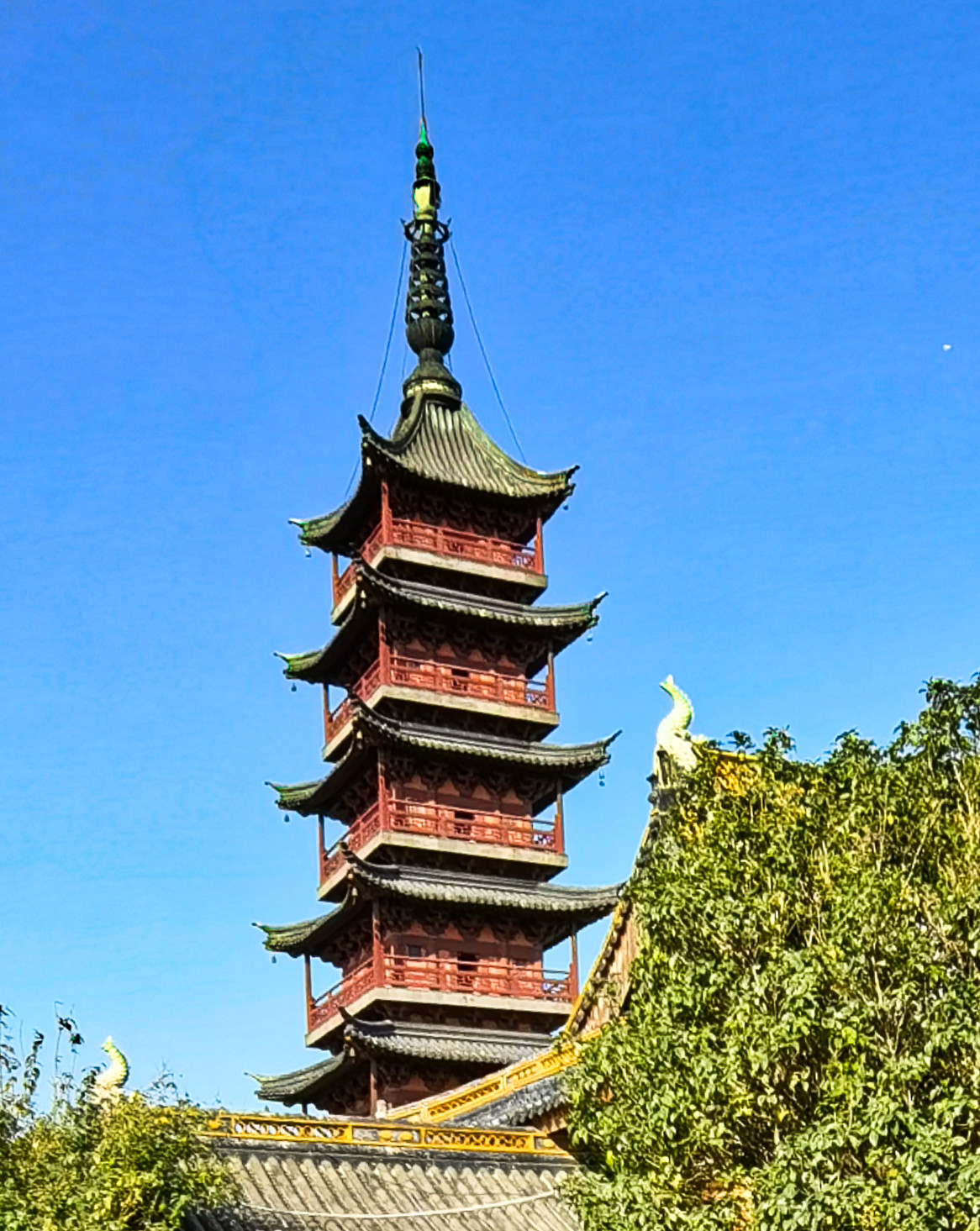 “秦峰塔” 酷似亭亭玉立的少女,又名“美人塔”。始建于南朝梁天监二年,延福禅寺僧从义,募建七级秦柱峰,明洪武年间重修。该塔系砖木,顶刹系铁铸,高二丈一尺,铁葫芦作顶,下焊八角环,每角立一紫铜小鸟,顶层四只翘角檐下系铜铃,阵风吹过,铜呤叮当,煞是令人心旷神怡。