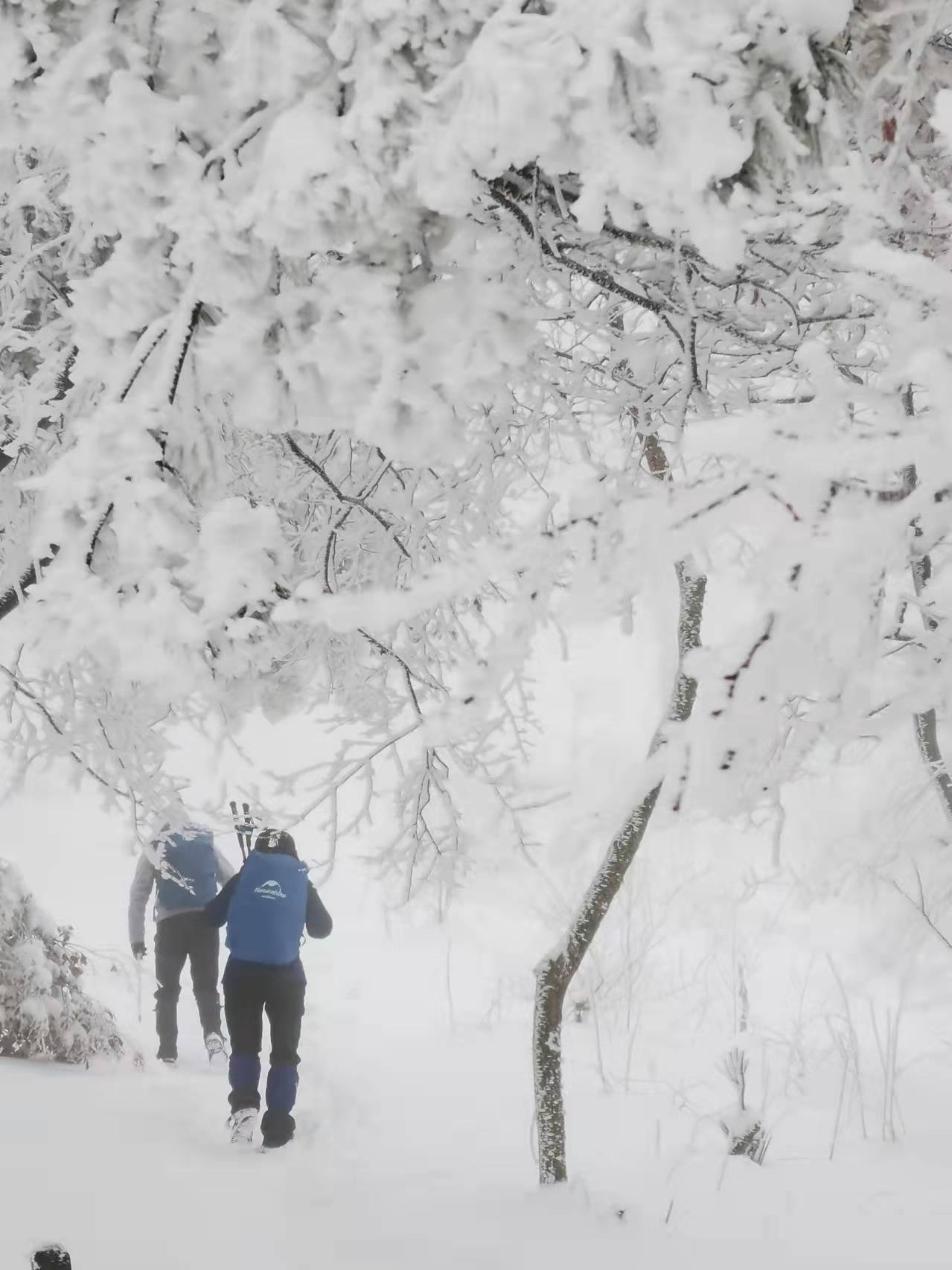 树枝上覆盖着晶莹剔透的霜雪,近观玉树凌空,琼花烂漫,远望白茫茫一片,仿佛上一秒还是漫天飞雪。