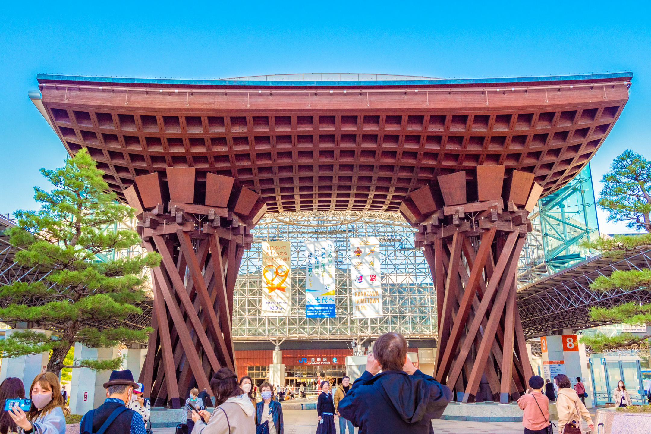 到了金泽出站既有惊喜。车站广场几何形状的玻璃天花板和以金泽传统能乐乐器“鼓”为形象设计的朱红鼓门非常漂亮, 金泽站被评选为“世界上最美的14个车站”之一,所以出站的时候,请准备好手机和相机!让我们从这里开启这次的旅程吧!