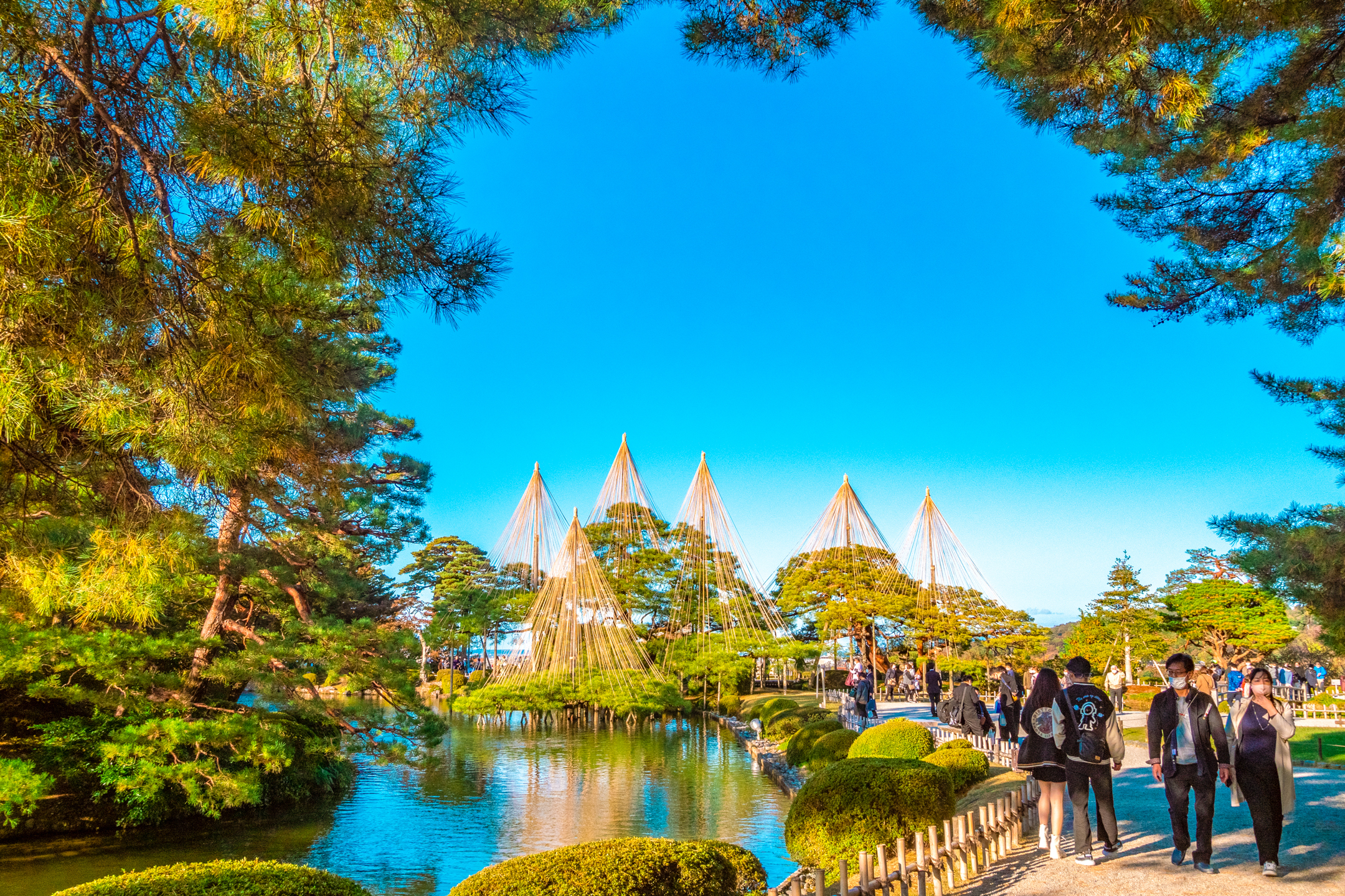 这座精美的园林建于17世纪中期,于今已有近4百年的历史。唐崎松枝繁叶茂,是兼六园里最漂亮的松树。冬天金泽地区降雪量也非常大, 所以树木之上都有数道垂线拉拽,誉为雪吊,就是防止落雪太大压坏树木。