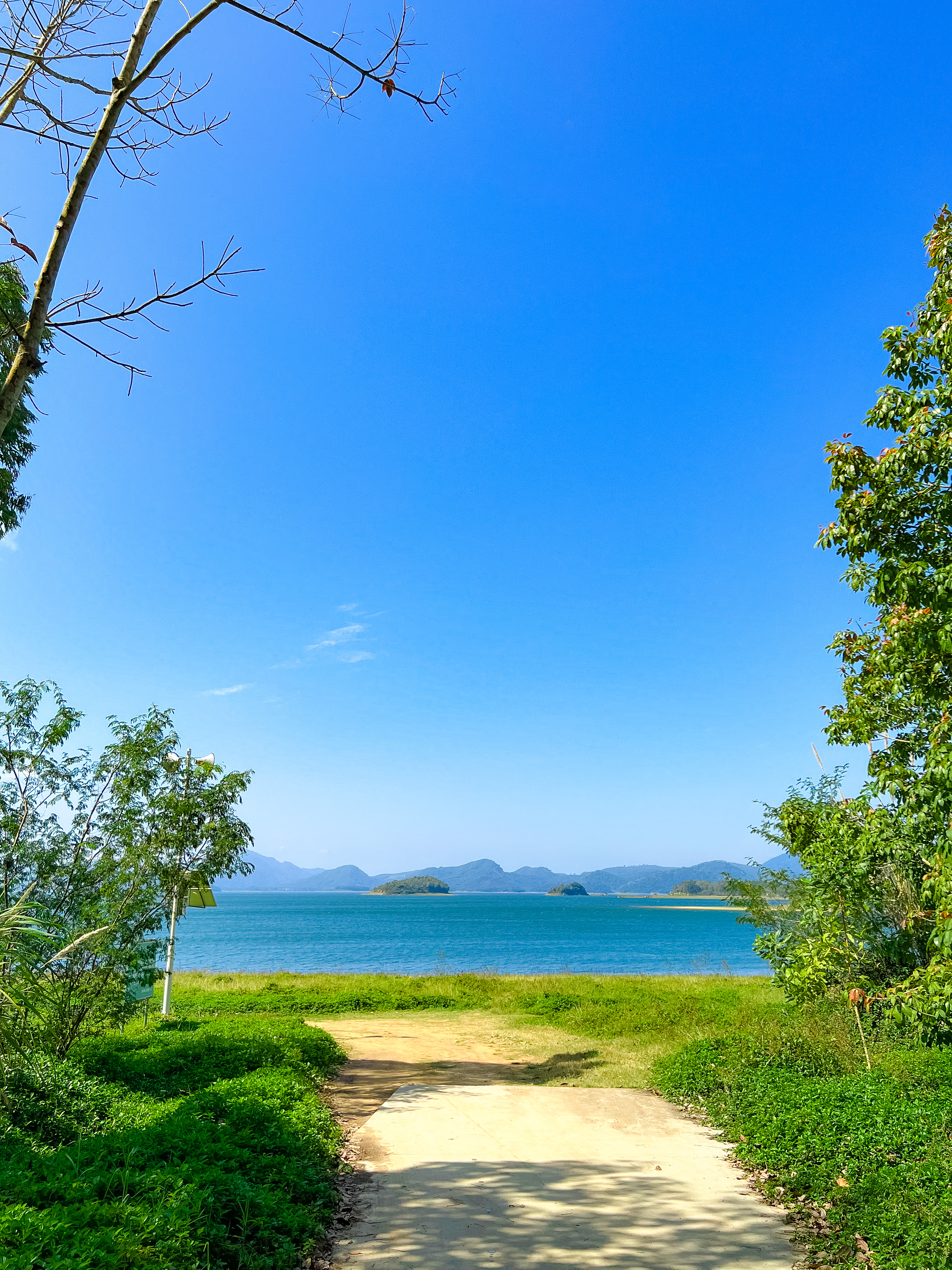 松涛水库是全国十大水库之一,也是海南省最大的水库,水库面积占据了儋州、白沙和琼中三块区域。在阳光的反射下,水面颜色呈现深海般的高饱和度的渐变蓝色,一点也不输海边。