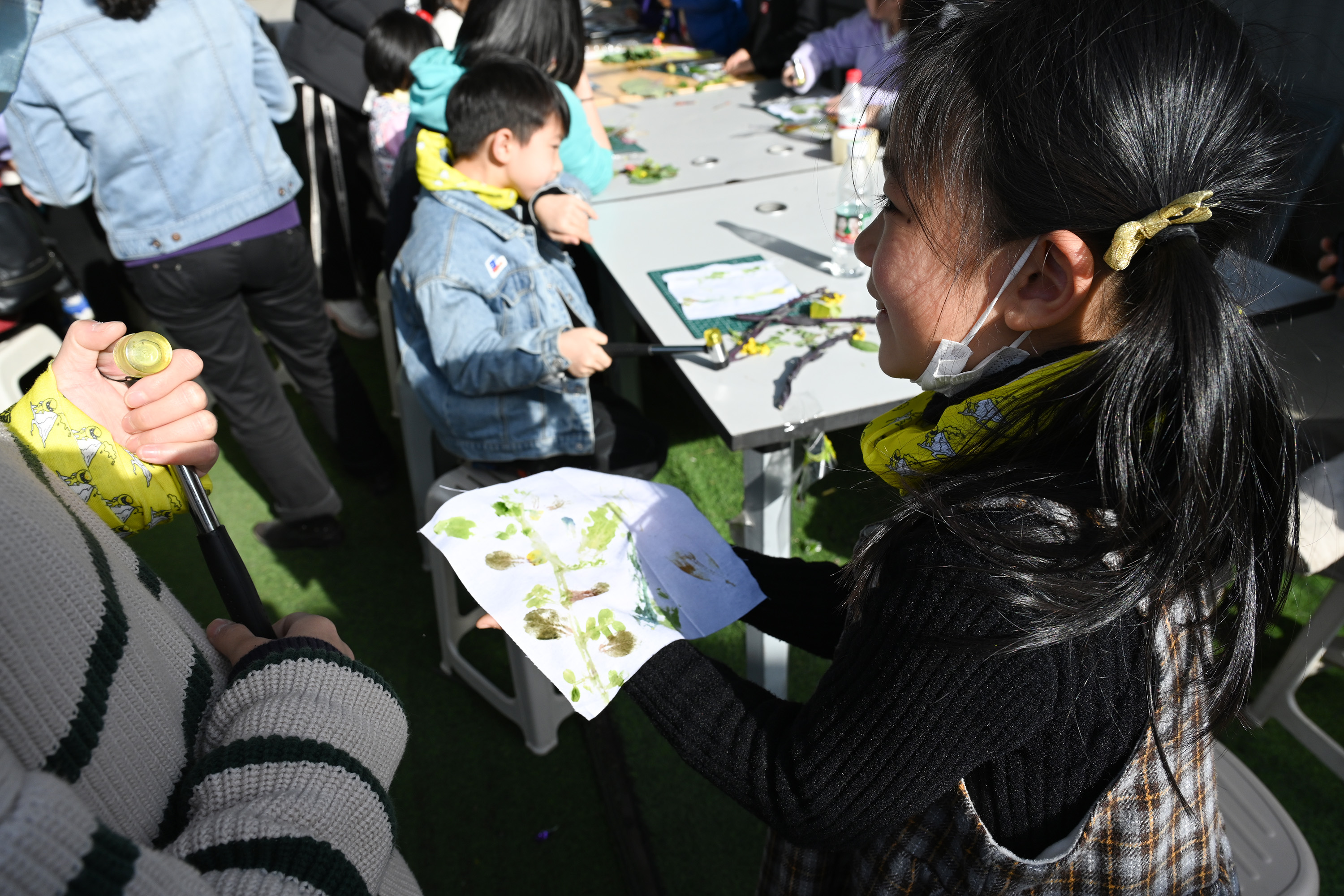 春色盎然,拾几捧花草,在素布上布局、固色、拍打,“咚咚咚”花瓣和叶片的原汁渐渐溢出,枝叶脉络一点点清晰地展现在手绢上,这就是植物拓印啦。耐心听完讲解后,宝贝们便跑到田野里采集自己心爱的花花草草。由于原理是通过将植物的汁液渗透到布料上,所以采集的花草不能是枯叶。同时,在敲打的过程中,并不是大力出奇迹,而是需要慢慢的沿着植物的脉络进行敲打,这样才能更好得将完整的枝叶形状复现到手绢上。