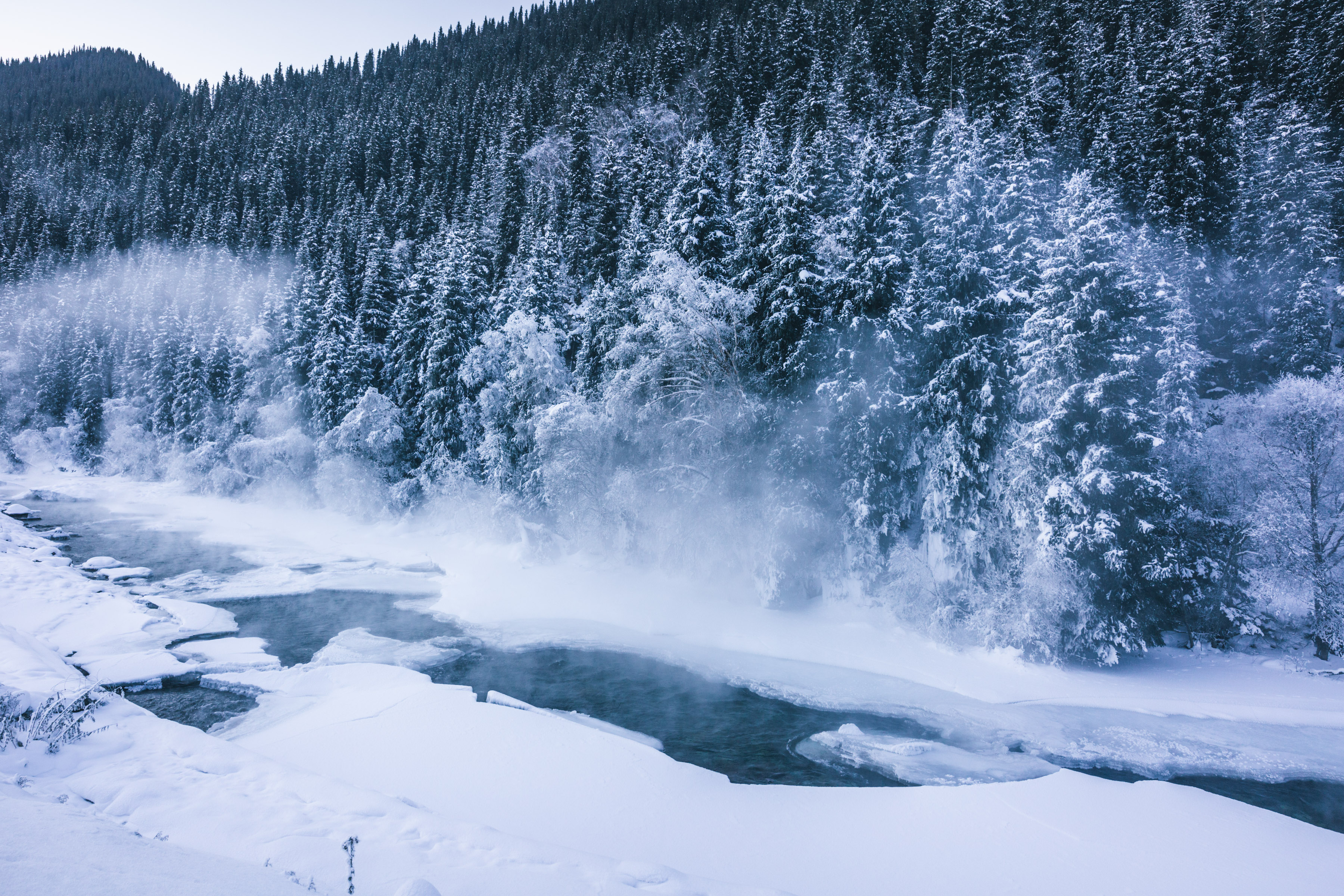 冬天的喀纳斯湖整个冰封,被白雪覆盖。冰面下的湖水,依旧保持着较高的水温,湖水从冰面下涌出,带着清澈的冰川融水流向山下。