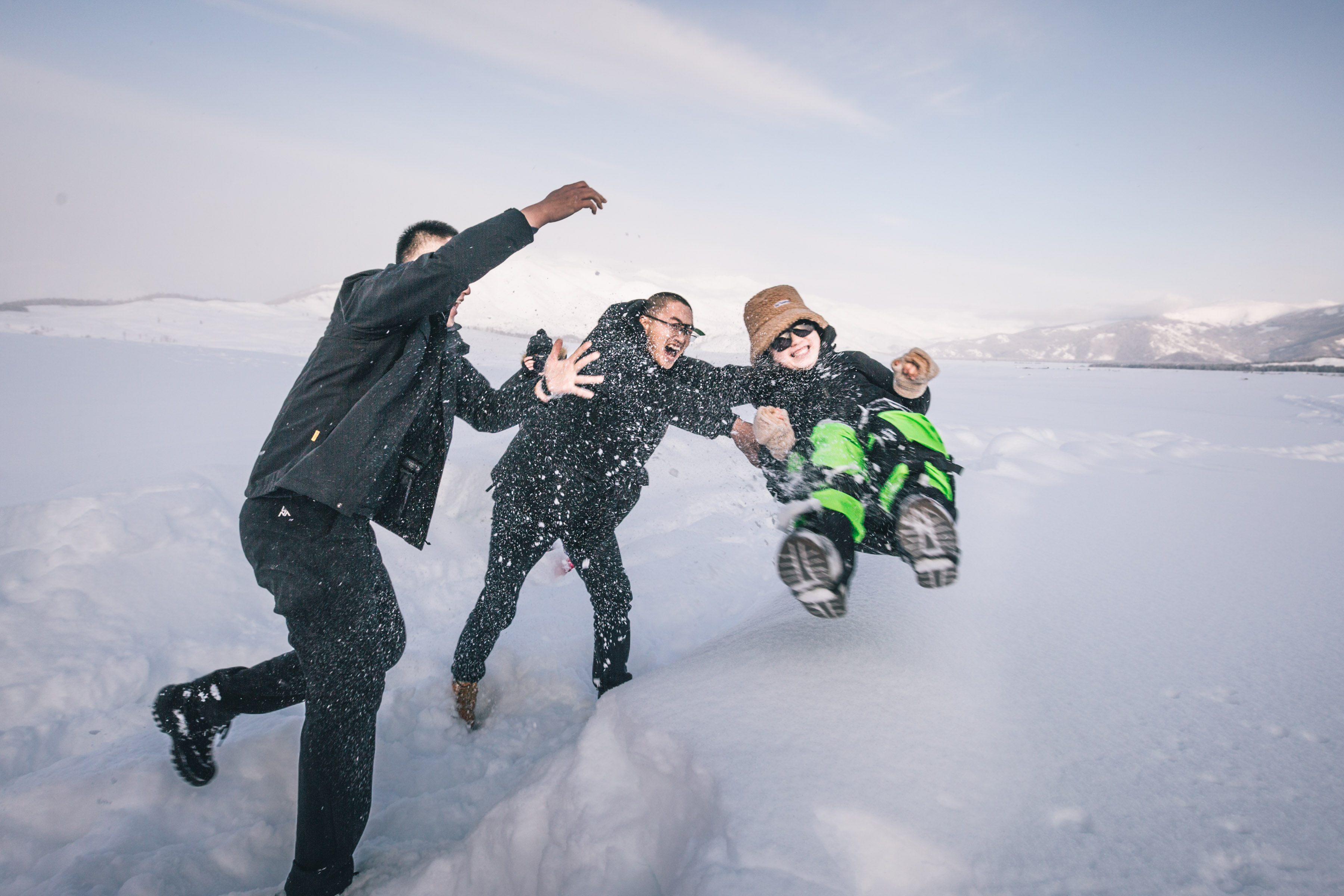我是跟一群有趣的小伙伴包车去的,司机给我们找了一处“秘密基地”,雪的厚度在半米-1米左右,两位司机大哥,拎起一个小姑娘就往雪地里扔!!!