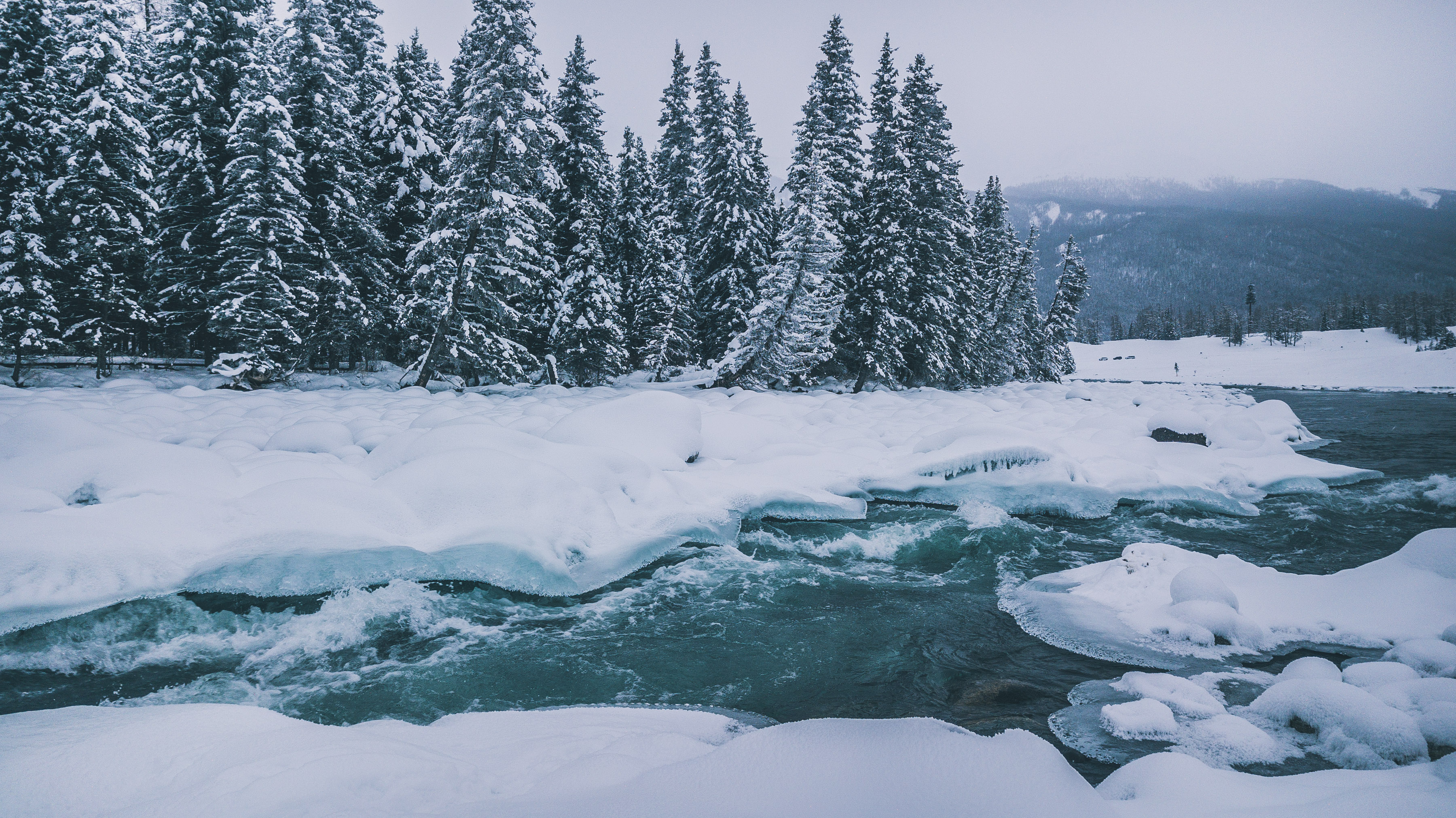 在这零下20度左右的低温下,喀纳斯河依旧能奔腾而出,给冰冻的喀纳斯带来了诸多梦幻景色。