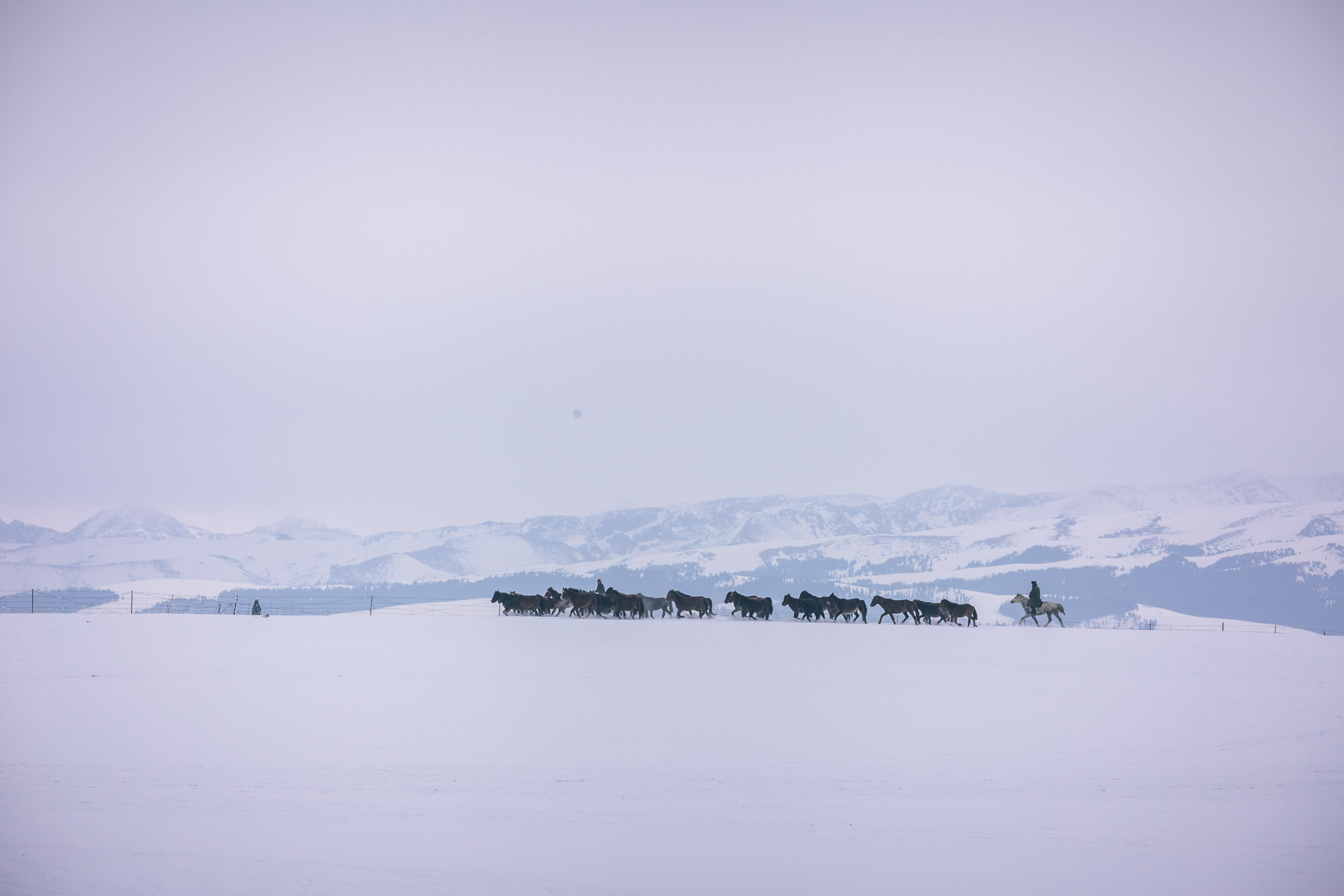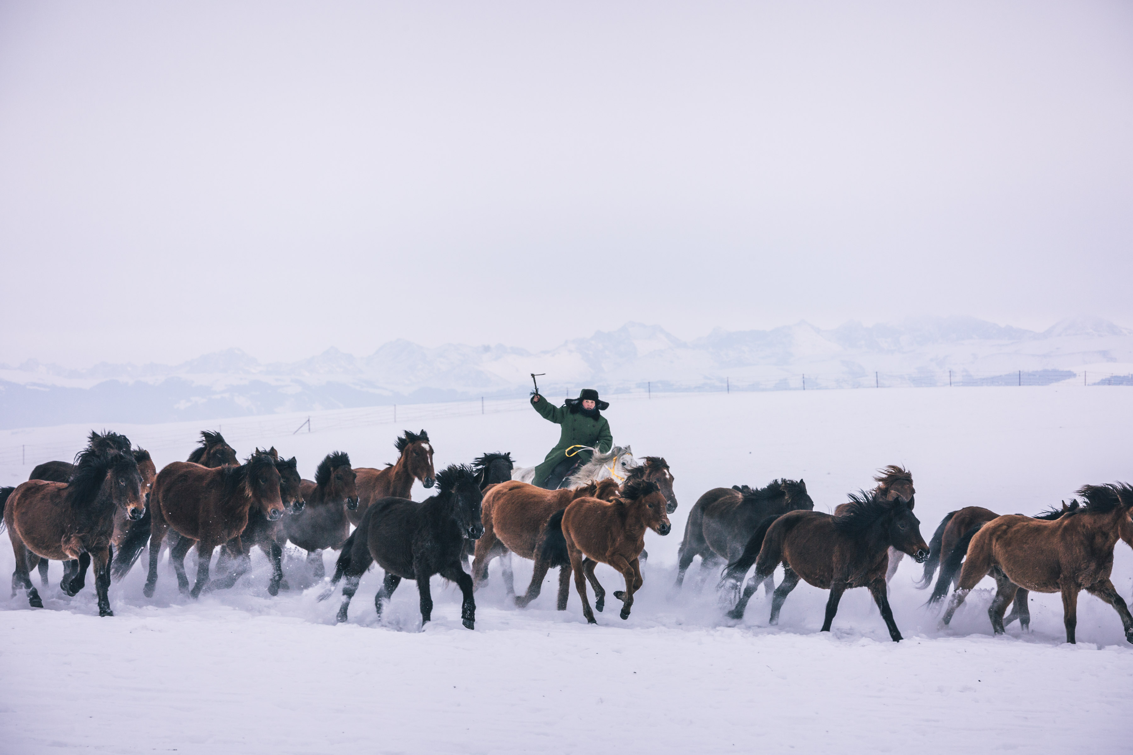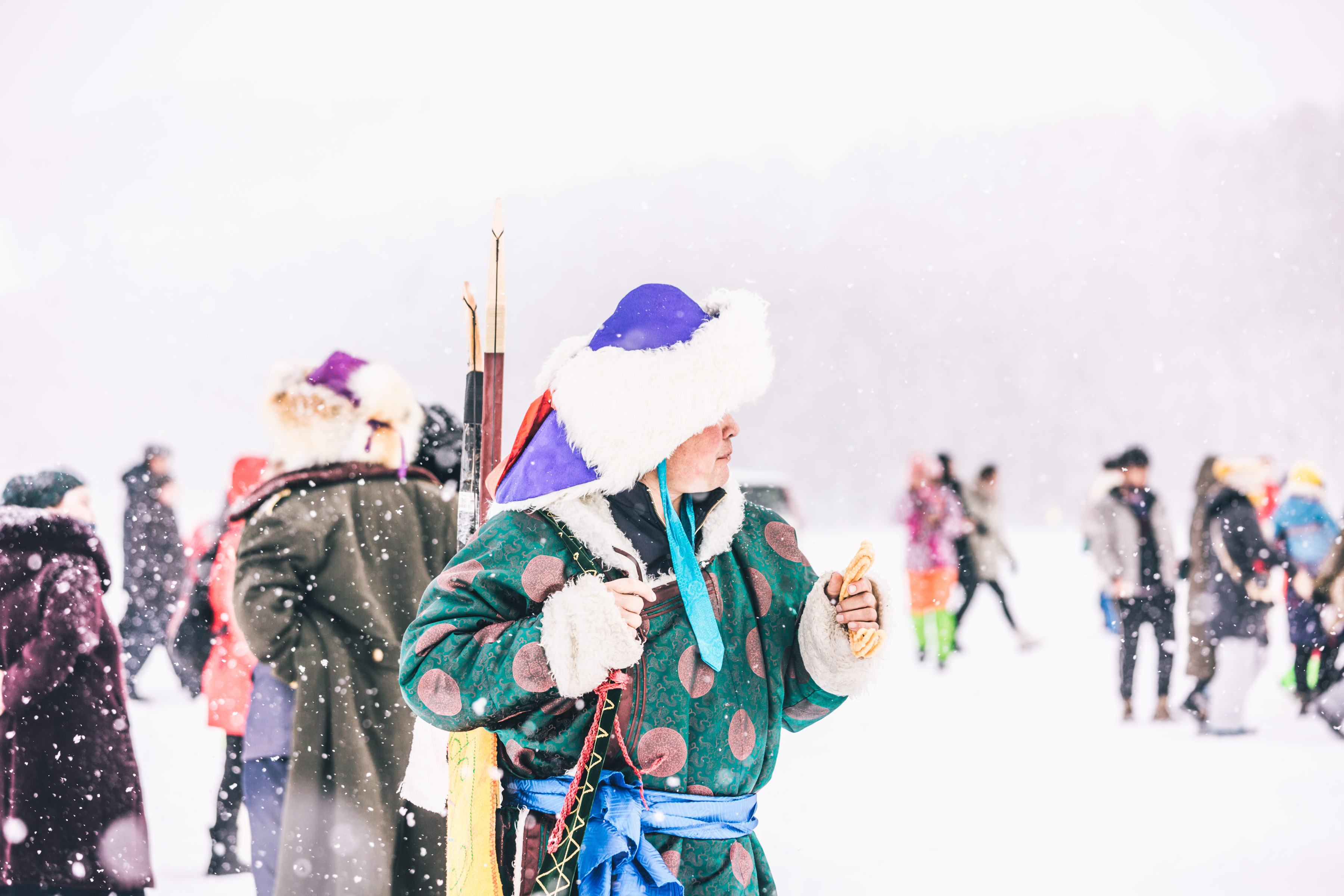 这次能在冰天雪地里欣赏不一样的比赛,大雪纷飞,积雪已经没过马蹄,甚至达到膝盖的厚度。所有的选手盛装出席,穿着羊皮大衣,羊毛帽子,选上自己最喜欢的骏马,为了提高观赏性,竞争品“羊”被换成了羊皮,可以更加灵活的“传球”,在雪地上马群奔跑,雪花四溅,甚是壮观。
