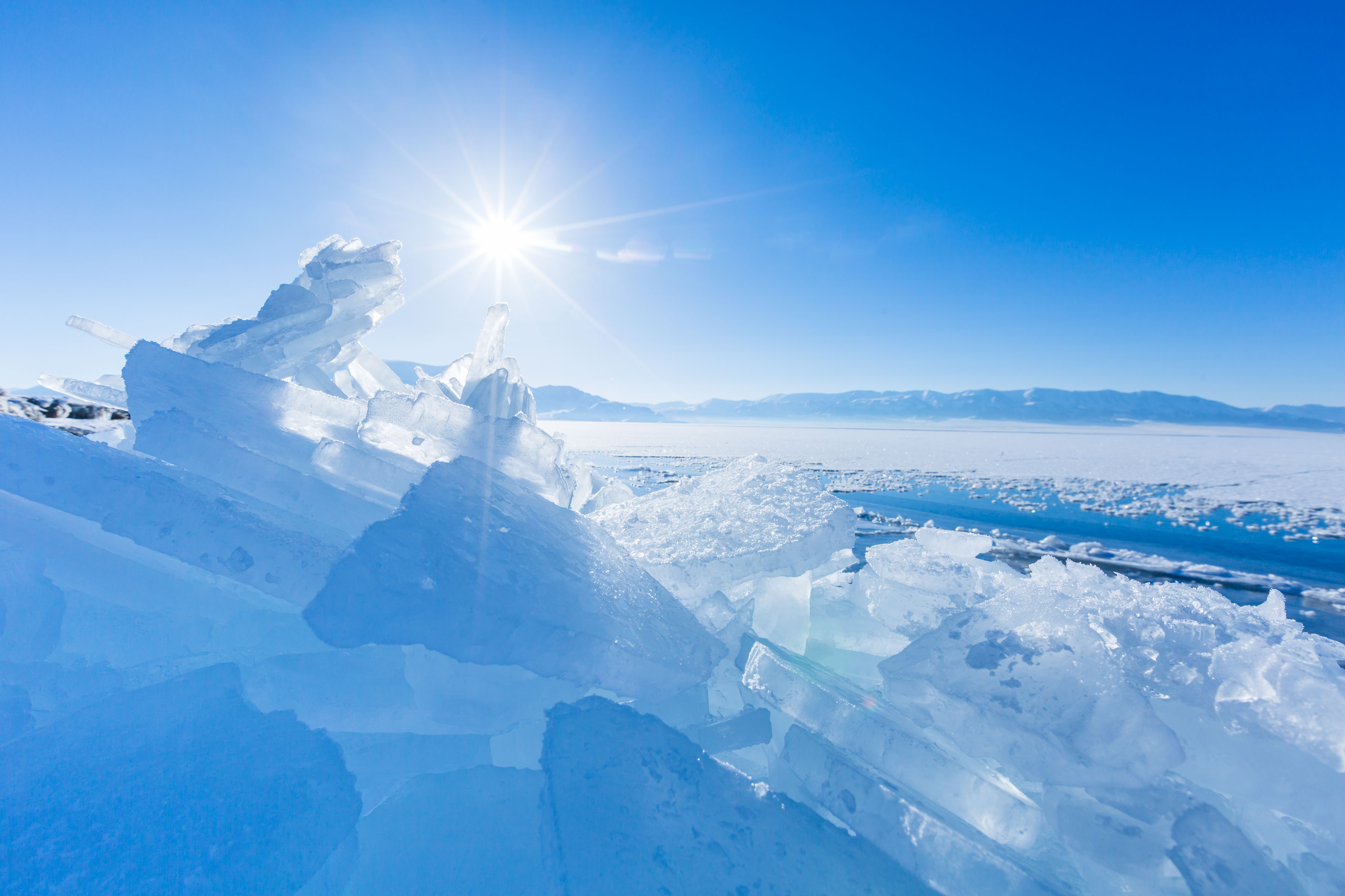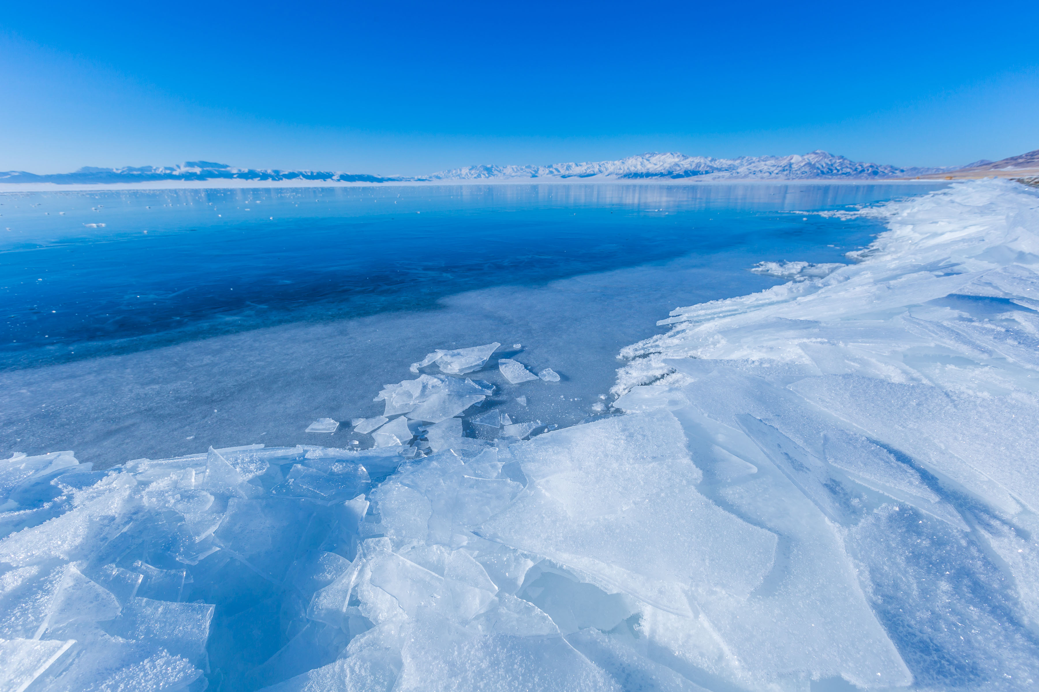 很幸运,我来到赛里木湖这天,天气晴朗,湖面刚结冰没多久,冰面上还没有多少积雪,湖面的蓝冰在太阳照射下清晰可见。