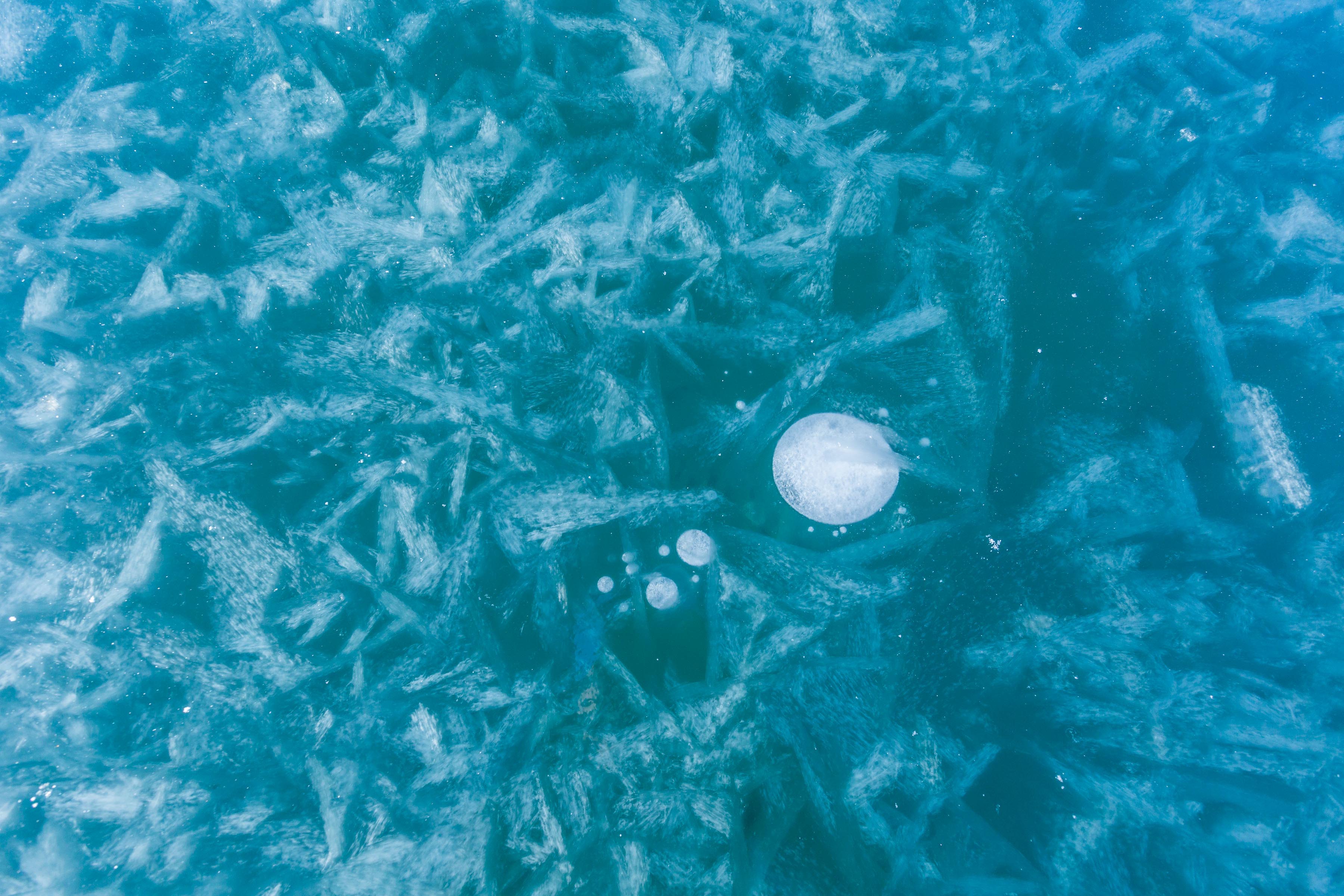 赛里木湖的蓝冰,还有一个看点就是冰泡。湖底的微生物和动植物会产生气泡,当时由于湖面被冻住,气泡会被冻在冰层之下,运气好的话,还可以看到一连串从小到大的冰泡串,我找了好久,只找到几个圆圆的冰泡,正巧上面还有一朵冰花。