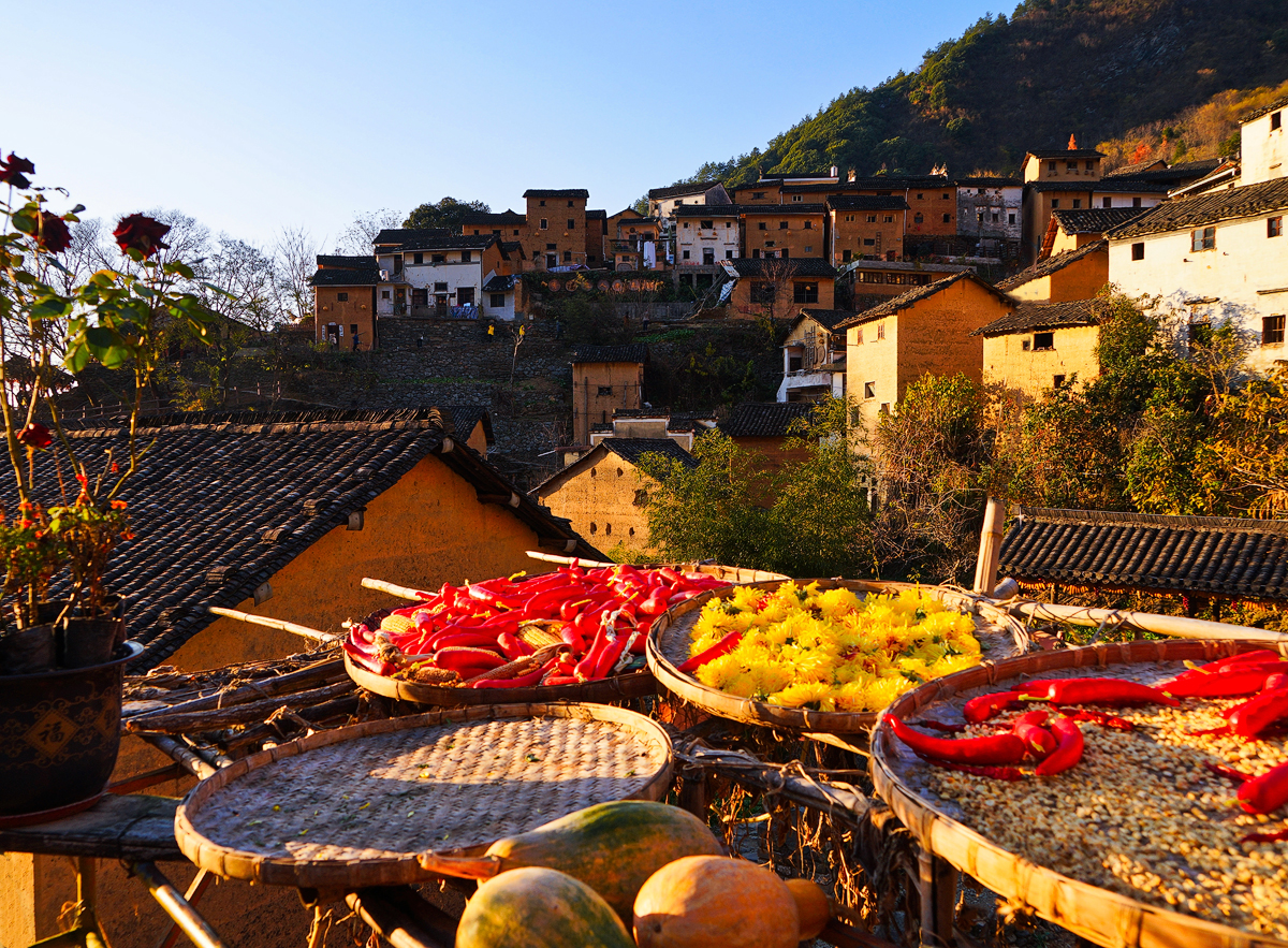 土楼群依山就势、千姿百态、这里的晒秋相比声名在外的婺源篁岭,也毫不逊色。游客们在皖南阳产土楼也可以观赏如此晒秋。