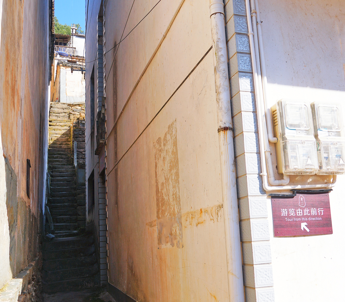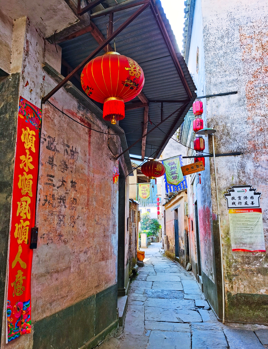 阳产村的土楼群鳞次栉比、错落有致、质朴美丽,这条巷子尤其引人注目。农家乐主人说花了不少钱,把这里打造成这般美不胜收的模样……