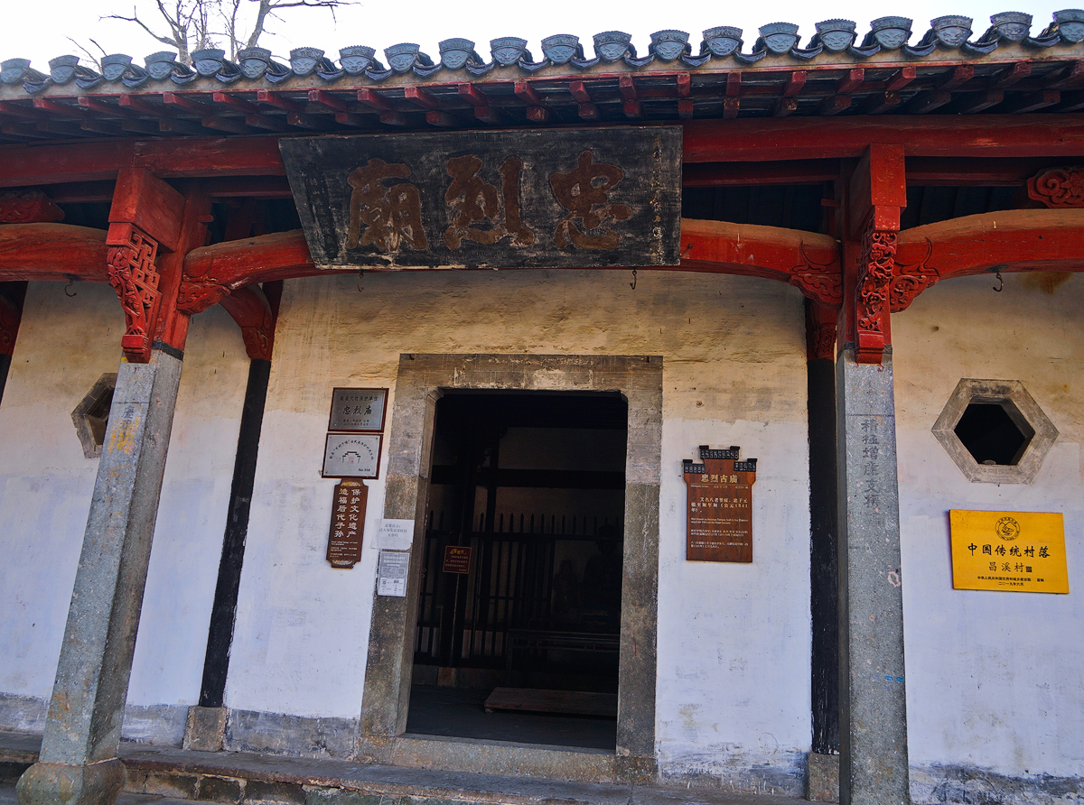 忠烈庙建于元代至正14年(1354年),该建筑分三间。左间供了土地菩萨、社公、社母神,以保昌溪五谷丰登,烟火不断;右间供了关帝及关平、周仓神像,以保昌溪四季平安,德义永驻;正间供了汪公大帝(越国公汪华)及其第八子(汪俊)两尊忠臣烈士父子神像,以保昌溪人丁兴旺,百业昌盛。