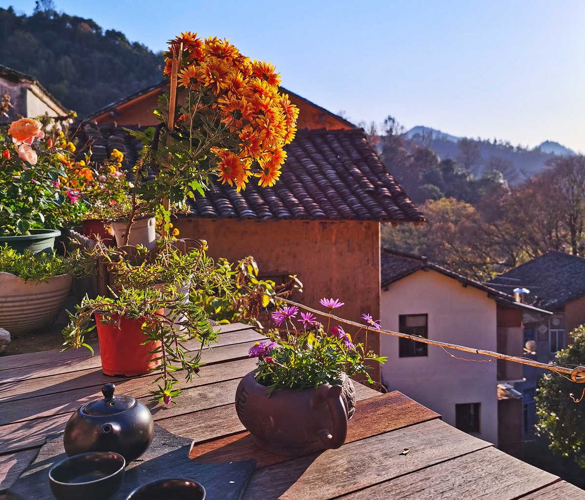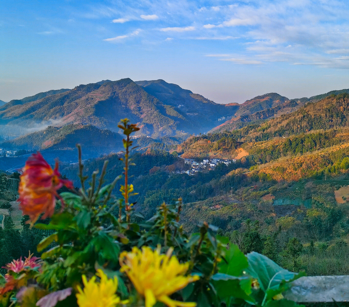 第二天一大清早,坡山醒了,我走出农家乐,借助长廊种植的菊花,鸡冠花,挂晒的玉米等,拍摄远处云雾缭绕的青山绿树,蓝天白云……