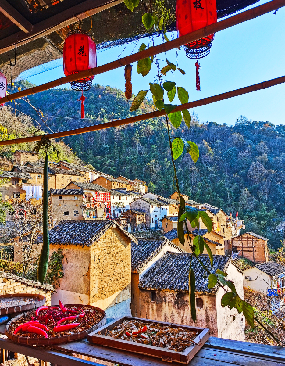 阳产土楼各家的门口或者窗户上,晒秋的各样农作物色彩斑斓。秋天的景色真美,山上绿色的树叶,农户家红红的灯笼,到处是一幅幅五色斑斓的“调色板”,展示着和分享着秋天的美景。