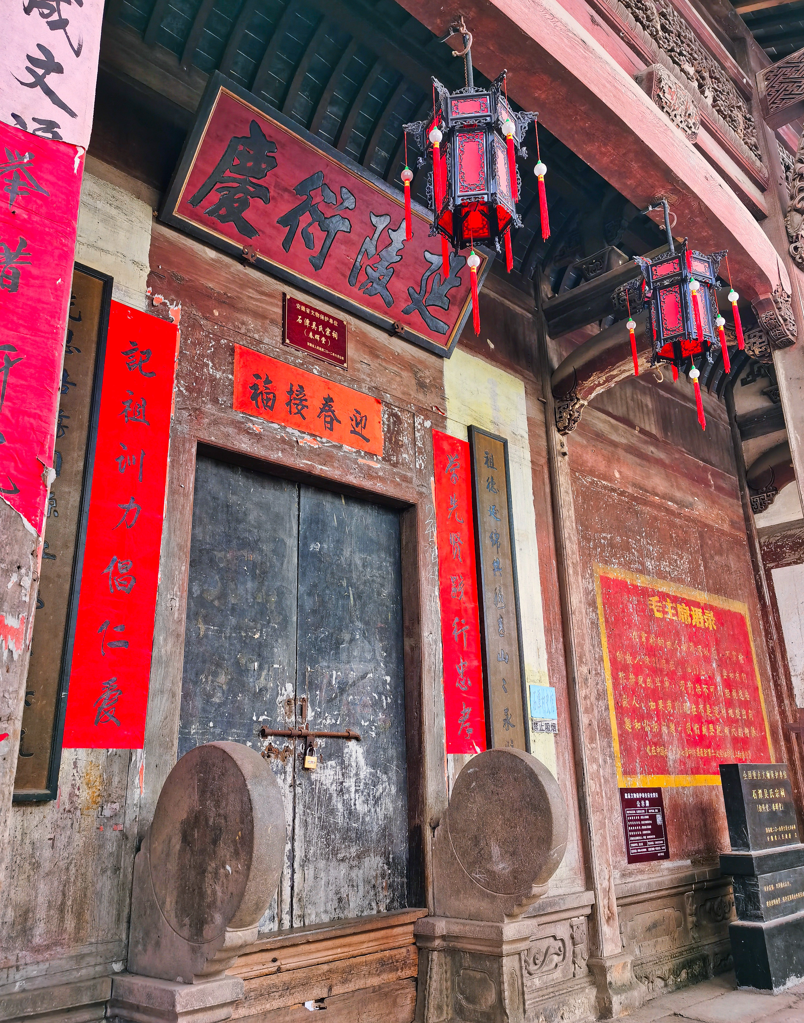 春晖堂,又名“上门祠堂”。首建于明天启元年(1621年)后因遭火灾被焚,于清嘉庆年间(1802年)重修。建筑面积为春晖堂720平方米,立面为三间三进,梁柱结构高大秀颀,后进护栏均用石料。祠前即紫荆堂,其明堂内长年积水不腐,故又名“活水明堂”。 大门上的“毛主席语录” 很有时代的感觉。