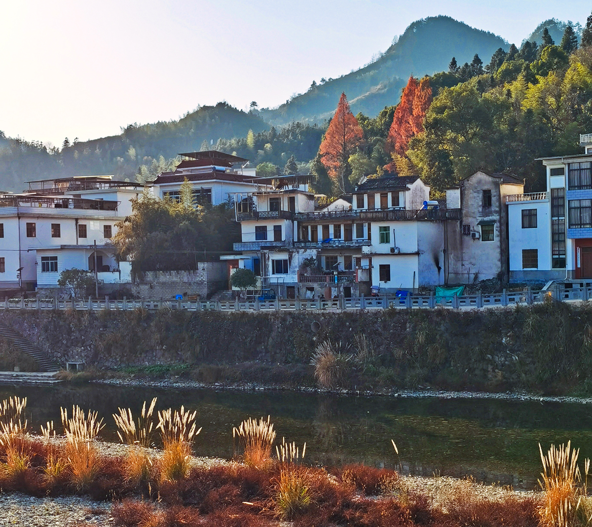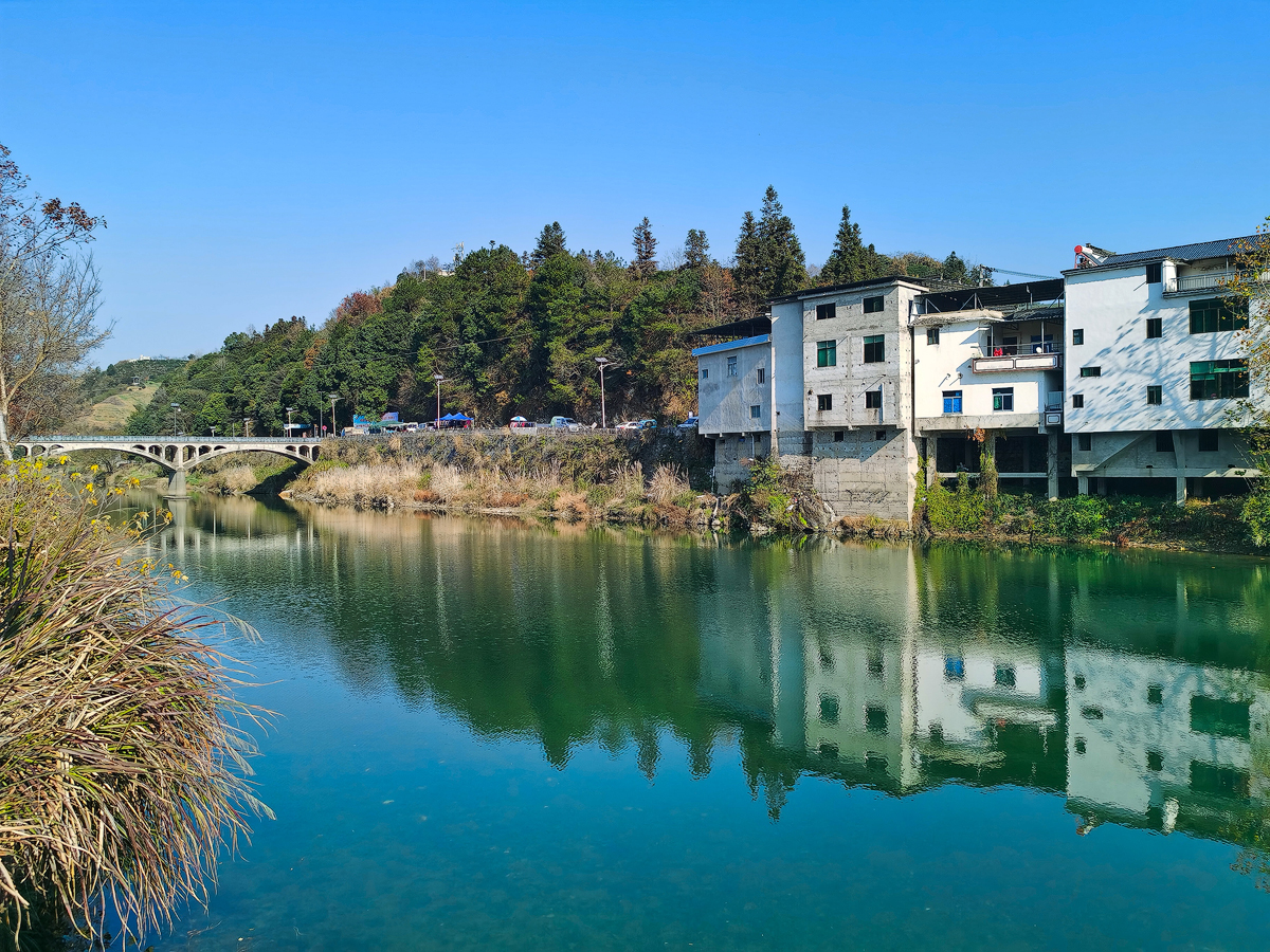 昌溪河水拍打着浪花从村旁顺势而过,几座粉墙黛瓦的房舍座落在河畔,轻盈而安静的依河而卧,在茂密的修竹掩映下,参差错落的勾勒出山村风情。