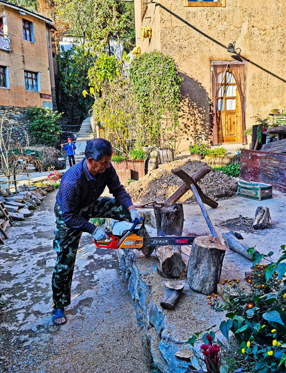 右面是下汰村 “ 云中山庄” 农家乐的夫妇俩。他们说村里大都是守宅老人,年轻人都选择到市区里学习工作。男主人还炫耀山里人特有的小暖炉呢!